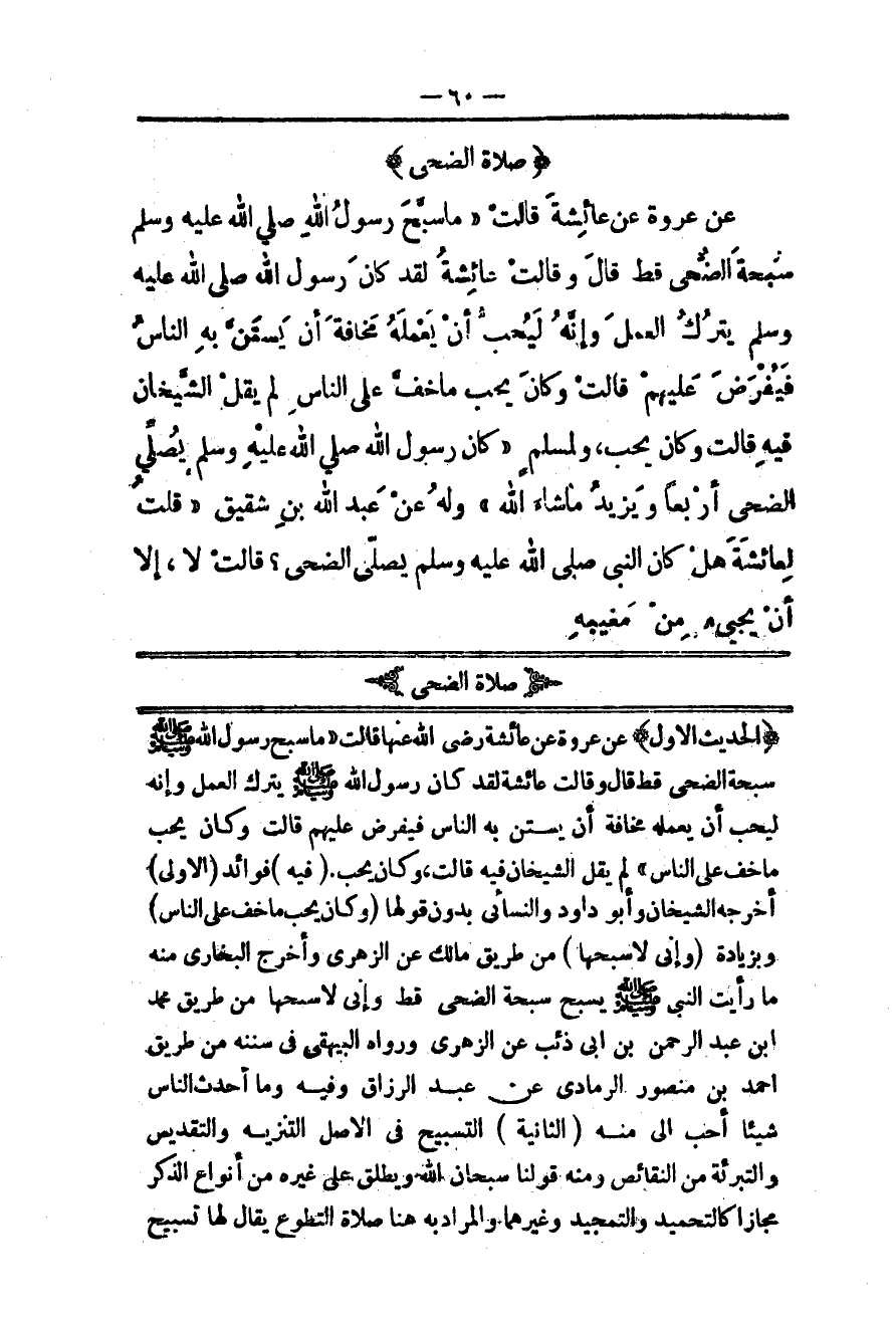 (صَلَاةُ الضُّحَى) (الْحَدِيثُ الْأَوَّلُ) عَنْ عُرْوَةَ عَنْ عَائِشَةَ - رَضِيَ اللَّهُ عَنْهَا - قَالَتْ «مَا سَبَّحَ رَسُولُ اللَّهِ - صَلَّى اللَّهُ عَلَيْهِ وَسَلَّمَ - سُبْحَةَ الضُّحَى قَطُّ» قَالَ وَقَالَتْ عَائِشَةُ لَقَدْ «كَانَ رَسُولُ اللَّهِ - صَلَّى اللَّهُ عَلَيْهِ وَسَلَّمَ - يَتْرُكُ الْعَمَلَ وَإِنَّهُ لَيُحِبُّ أَنْ يَعْمَلَهُ مَخَافَةَ أَنْ يَسْتَنَّ بِهِ النَّاسُ فَيُفْرَضَ عَلَيْهِمْ» قَالَتْ «وَكَانَ يُحِبُّ مَا خَفَّ عَلَى النَّاسِ» لَمْ يَقُلْ الشَّيْخَانِ فِيهِ قَالَتْ، «وَكَانَ يُحِبُّ» .