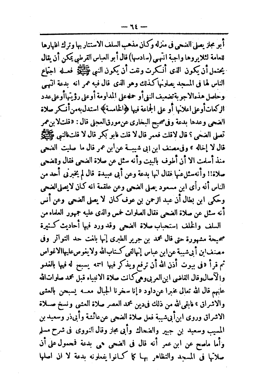 وَعَنْ أَنَسٍ أَنَّهُ سُئِلَ عَنْ صَلَاةِ الضُّحَى فَقَالَ الصَّلَوَاتُ خَمْسٌ وَاَلَّذِي عَلَيْهِ جُمْهُورُ الْعُلَمَاءِ مِنْ السَّلَفِ وَالْخَلَفِ اسْتِحْبَابُ صَلَاةِ الضُّحَى وَقَدْ وَرَدَ فِيهَا أَحَادِيثُ كَثِيرَةٌ صَحِيحَةٌ مَشْهُورَةٌ حَتَّى قَالَ مُحَمَّدُ بْنُ جَرِيرٍ الطَّبَرِيُّ إنَّهَا بَلَغَتْ حَدَّ التَّوَاتُرِ وَفِي مُصَنَّفِ ابْنِ أَبِي شَيْبَةَ عَنْ ابْنِ عَبَّاسٍ إنَّهَا لَفِي كِتَابِ اللَّهِ وَلَا يَغُوصُ عَلَيْهَا الْأَغْوَاصَ ثُمَّ قَرَأَ {فِي بُيُوتٍ أَذِنَ اللَّهُ أَنْ تُرْفَعَ وَيُذْكَرَ فِيهَا اسْمُهُ يُسَبِّحُ لَهُ فِيهَا بِالْغُدُوِّ وَالآصَالِ} [النور: 36] وَقَالَ الْقَاضِي ابْنُ الْعَرَبِيِّ وَهِيَ كَانَتْ صَلَاةَ الْأَنْبِيَاءِ قَبْلَ مُحَمَّدٍ - صَلَوَاتُ اللَّهِ عَلَيْهِمْ - قَالَ اللَّهُ تَعَالَى مُخْبِرًا عَنْ دَاوُد {إِنَّا سَخَّرْنَا الْجِبَالَ مَعَهُ يُسَبِّحْنَ بِالْعَشِيِّ وَالإِشْرَاقِ} [ص: 18] فَأَبْقَى اللَّهُ مِنْ ذَلِكَ فِي دِينِ مُحَمَّدٍ الْعَصْرَ صَلَاةَ الْعَشِيِّ وَنَسَخَ صَلَاةَ الْإِشْرَاقِ وَرَوَى ابْنُ أَبِي شَيْبَةَ فِعْلَ صَلَاةِ الضُّحَى عَنْ عَائِشَةَ وَأَبِي ذَرٍّ وَسَعِيدِ بْنِ الْمُسَيِّبِ وَسَعِيدِ بْنِ جُبَيْرٍ وَالضَّحَّاكِ وَأَبِي مِجْلَزٍ وَقَالَ النَّوَوِيُّ فِي شَرْحِ مُسْلِمٍ وَأَمَّا مَا صَحَّ عَنْ ابْنِ عُمَرَ إنَّهُ قَالَ فِي الضُّحَى هِيَ بِدْعَةٌ فَمَحْمُولٌ عَلَى أَنَّ صَلَاتَهَا فِي الْمَسْجِدِ وَالتَّظَاهُرَ بِهَا كَمَا كَانُوا يَفْعَلُونَهُ بِدْعَةٌ لَا أَنَّ أَصْلَهَا