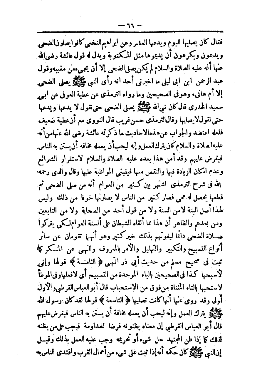 وَمَا رَوَاهُ التِّرْمِذِيُّ عَنْ عَطِيَّةَ الْعَوْفِيِّ عَنْ أَبِي سَعِيدٍ الْخُدْرِيِّ قَالَ «كَانَ نَبِيُّ اللَّهِ - صَلَّى اللَّهُ عَلَيْهِ وَسَلَّمَ - يُصَلِّي الضُّحَى حَتَّى نَقُولَ لَا يَدَعُهَا وَيَدَعُهَا حَتَّى نَقُولَ لَا يُصَلِّيهَا» وَقَالَ التِّرْمِذِيُّ حَسَنٌ غَرِيبٌ قَالَ النَّوَوِيُّ مَعَ أَنَّ عَطِيَّةَ ضَعِيفٌ فَلَعَلَّهُ اُعْتُضِدَ وَالْجَوَابُ عَنْ هَذِهِ الْأَحَادِيثِ مَا ذَكَرَتْهُ عَائِشَةُ - رَضِيَ اللَّهُ عَنْهَا - مِنْ «أَنَّهُ - عَلَيْهِ الصَّلَاةُ وَالسَّلَامُ - كَانَ يَتْرُكُ الْعَمَلَ وَإِنَّهُ لَيُحِبُّ أَنْ يَعْمَلَهُ مَخَافَةَ أَنْ يَسْتَنَّ بِهِ النَّاسُ فَيُفْرَضَ عَلَيْهِمْ» وَقَدْ أُمِنَ هَذَا بَعْدَهُ - عَلَيْهِ الصَّلَاةُ وَالسَّلَامُ - لِاسْتِقْرَارِ الشَّرَائِعِ وَعَدَمِ إمْكَانِ الزِّيَادَةِ فِيهَا وَالنَّقْصِ مِنْهَا فَيَنْبَغِي الْمُوَاظَبَةُ عَلَيْهَا وَقَالَ وَالِدِي - رَحِمَهُ اللَّهُ - فِي شَرْحِ التِّرْمِذِيِّ اشْتَهَرَ بَيْنَ كَثِيرٍ مِنْ الْعَوَامّ أَنَّهُ مَنْ صَلَّى الضُّحَى ثُمَّ قَطَعَهَا يَحْصُلُ لَهُ عَمًى فَصَارَ كَثِيرٌ مِنْ النَّاسِ لَا يُصَلُّونَهَا خَوْفًا مِنْ ذَلِكَ وَلَيْسَ لِهَذَا أَصْلٌ أَلْبَتَّةَ لَا مِنْ السُّنَّةِ وَلَا مِنْ قَوْلِ أَحَدٍ مِنْ الصَّحَابَةِ وَلَا مِنْ التَّابِعِينَ وَمَنْ بَعْدَهُمْ وَالظَّاهِرُ أَنَّ هَذَا مِمَّا أَلْقَاهُ الشَّيْطَانُ عَلَى أَلْسِنَةِ الْعَوَامّ لِكَيْ يَتْرُكُوا صَلَاةَ الضُّحَى دَائِمًا لِيَفُوتَهُمْ بِذَلِكَ خَيْرٌ كَثِيرٌ وَهُوَ أَنَّهُمَا تَقُومَانِ عَنْ سَائِرِ أَنْوَاعِ التَّسْبِيحِ وَالتَّكْبِيرِ وَالتَّهْلِيلِ وَالْأَمْرِ بِالْمَعْرُوفِ وَالنَّهْيِ عَنْ الْمُنْكَرِ كَمَا ثَبَتَ فِي صَحِيحِ مُسْلِمٍ مِنْ حَدِيثِ أَبِي ذَرٍّ انْتَهَى.