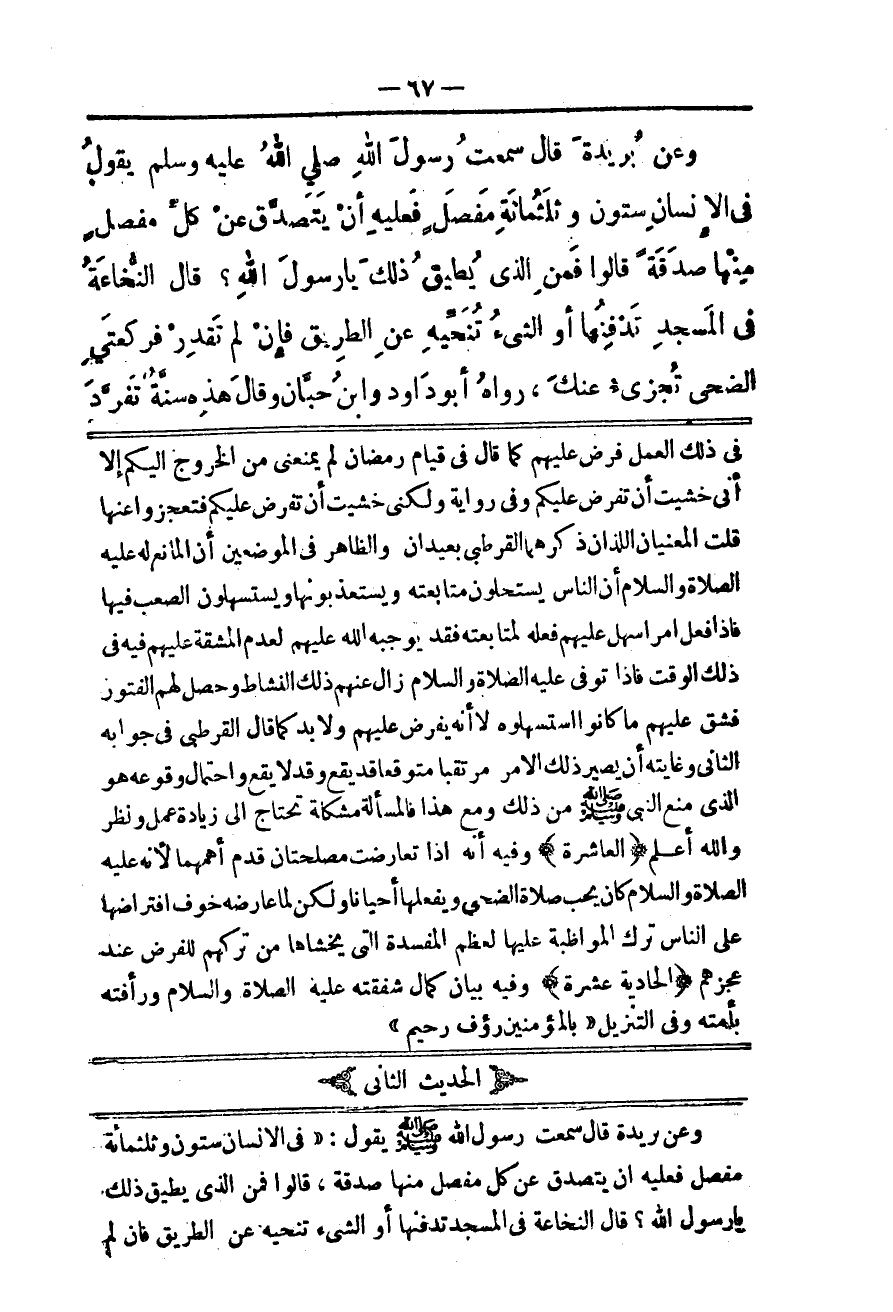 (الْحَدِيثُ الثَّانِي) وَعَنْ بُرَيْدَةَ قَالَ «سَمِعْت رَسُولَ اللَّهِ - صَلَّى اللَّهُ عَلَيْهِ وَسَلَّمَ - يَقُولُ: فِي الْإِنْسَانِ سِتُّونَ وَثَلَثُمِائَةِ مَفْصِلٍ فَعَلَيْهِ أَنْ يَتَصَدَّقَ عَنْ كُلِّ مَفْصِلٍ مِنْهَا صَدَقَةً، قَالُوا فَمَنْ الَّذِي يُطِيقُ ذَلِكَ يَا رَسُولَ اللَّهِ؟ قَالَ النُّخَاعَةُ فِي الْمَسْجِدِ تَدْفِنُهَا أَوْ الشَّيْءُ تُنَحِّيهِ عَنْ الطَّرِيقِ فَإِنْ لَمْ