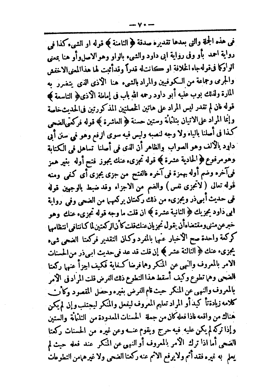 (الْعَاشِرَةُ) قَوْلُهُ فَرَكْعَتَيْ الضُّحَى كَذَا فِي أَصْلِنَا بِالْيَاءِ وَلَا وَجْهَ لِنَصْبِهِ وَلَيْسَ فِيهِ سِوَى الرَّفْعِ وَهُوَ فِي سُنَنِ أَبِي دَاوُد بِالْأَلِفِ وَهُوَ الصَّوَابُ وَالظَّاهِرُ أَنَّ الَّذِي فِي أَصْلِنَا تَسَاهُلٌ فِي الْكِتَابَةِ وَهُوَ مَرْفُوعٌ.