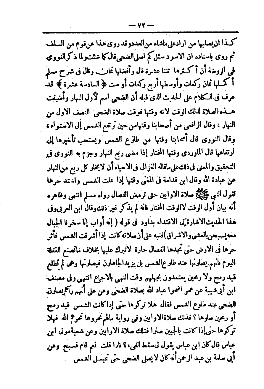 وَعَنْ عَلِيٍّ أَنَّهُمْ رَآهُمْ يُصَلُّونَ الضُّحَى عِنْدَ طُلُوعِ الشَّمْسِ فَقَالَ هَلَّا تَرَكُوهَا حَتَّى إذَا كَانَتْ الشَّمْسُ قَيْدَ رُمْحٍ أَوْ رُمْحَيْنِ صَلَّوْهَا؟ فَذَلِكَ صَلَاةُ الْأَوَّابِينَ وَفِي رِوَايَةٍ مَا لَهُمْ نَحَرُوهَا نَحَرَهُمْ اللَّهُ فَهَلَّا تَرَكُوهَا حَتَّى إذَا كَانَتْ بِالْجَبِينِ صَلَّوْا فَتِلْكَ صَلَاةُ الْأَوَّابِينَ وَعَنْ شُعْبَةَ مَوْلَى ابْنِ عَبَّاسٍ قَالَ كَانَ ابْنُ عَبَّاسٍ يَقُولُ لِي سَقَطَ الْفَيْءُ؟ فَإِذَا قُلْت نَعَمْ قَامَ فَسَبَّحَ وَعَنْ أَبِي سَلَمَةَ بْنِ عَبْدِ الرَّحْمَنِ أَنَّهُ كَانَ لَا يُصَلِّي الضُّحَى حَتَّى تَمِيلَ الشَّمْسُ.