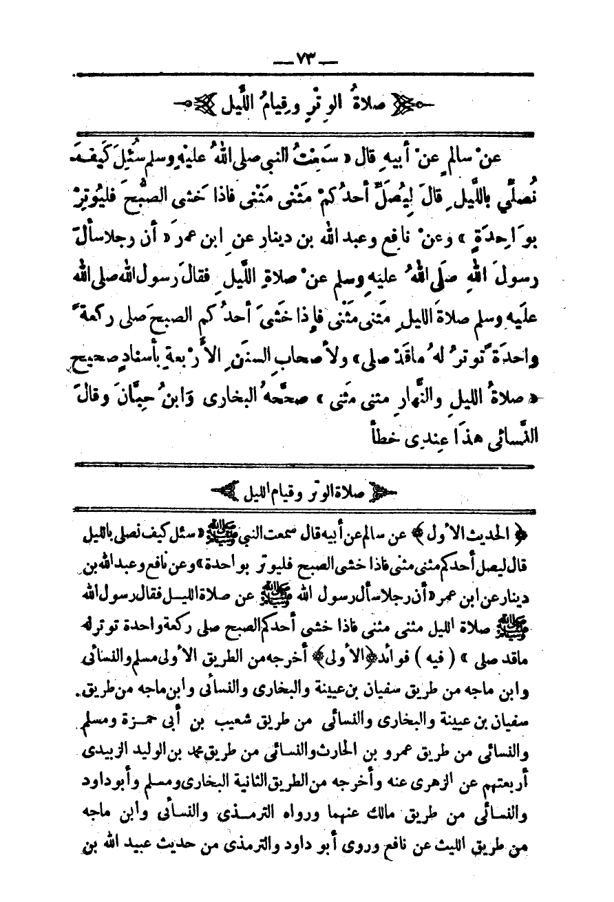 صَلَاةُ الْوِتْرِ وَقِيَامُ اللَّيْلِ عَنْ سَالِمٍ عَنْ أَبِيهِ قَالَ «سَمِعْت النَّبِيَّ - صَلَّى اللَّهُ عَلَيْهِ وَسَلَّمَ - سُئِلَ كَيْفَ نُصَلِّي بِاللَّيْلِ قَالَ لِيُصَلِّ أَحَدُكُمْ مَثْنَى مَثْنَى فَإِذَا خَشِيَ الصُّبْحَ فَلْيُوتِرْ بِوَاحِدَةٍ» وَعَنْ نَافِعٍ وَعَبْدِ اللَّهِ بْنِ دِينَارٍ عَنْ ابْنِ عُمَرَ «أَنَّ رَجُلًا سَأَلَ رَسُولَ اللَّهِ - صَلَّى اللَّهُ عَلَيْهِ وَسَلَّمَ - عَنْ صَلَاةِ اللَّيْلِ فَقَالَ رَسُولُ اللَّهِ - صَلَّى اللَّهُ عَلَيْهِ وَسَلَّمَ - صَلَاةُ اللَّيْلِ مَثْنَى مَثْنَى فَإِذَا خَشِيَ أَحَدُكُمْ الصُّبْحَ صَلَّى رَكْعَةً وَاحِدَةً تُوتِرُ لَهُ مَا قَدْ صَلَّى» وَلِأَصْحَابِ السُّنَنِ الْأَرْبَعَةِ بِإِسْنَادٍ صَحِيحٍ «صَلَاةُ اللَّيْلِ وَالنَّهَارِ مَثْنَى مَثْنَى» صَحَّحَهُ الْبُخَارِيُّ وَابْنُ حِبَّانَ وَقَالَ النَّسَائِيّ هَذَا عِنْدِي خَطَأٌ.