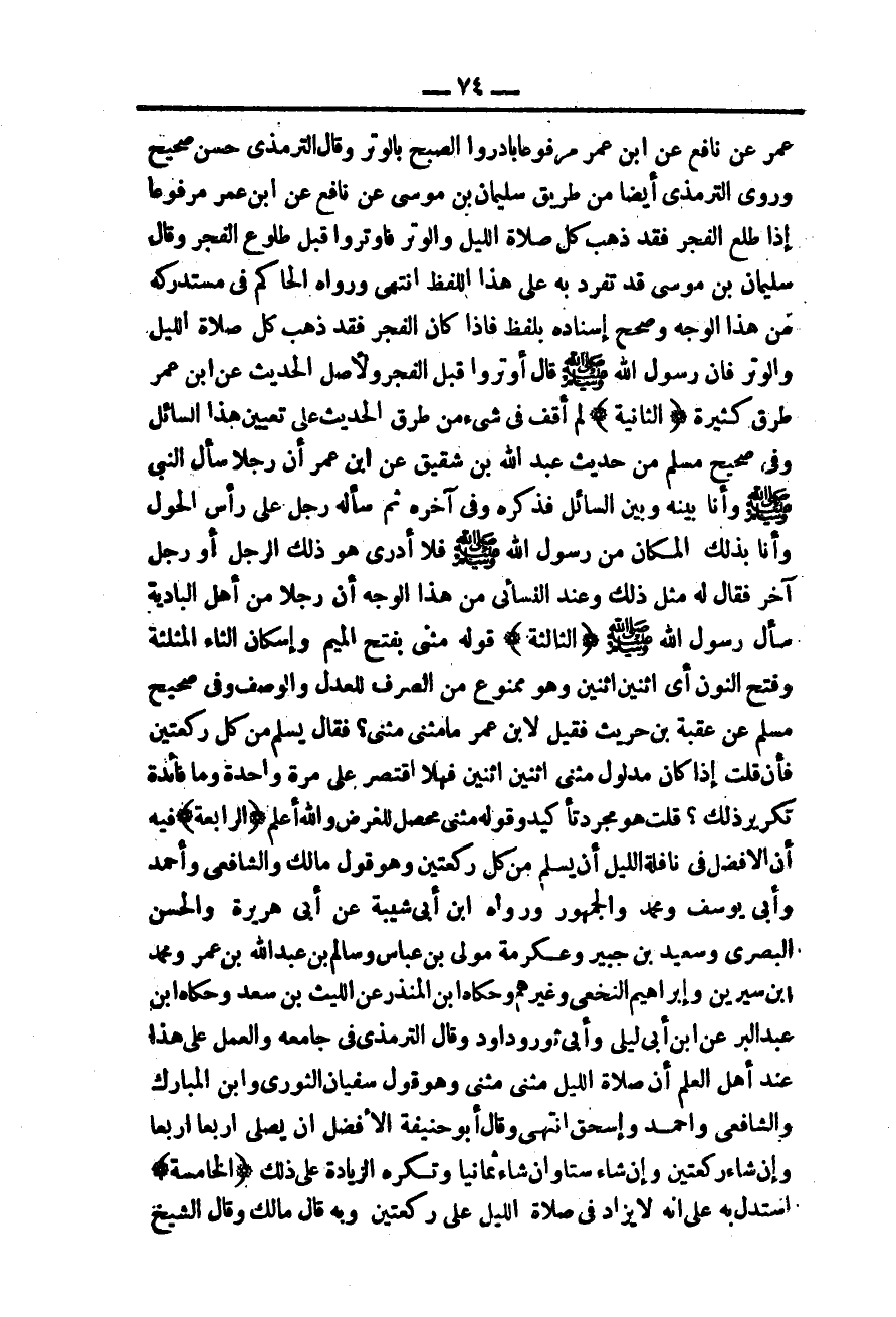 وَرَوَى التِّرْمِذِيُّ أَيْضًا مِنْ طَرِيقِ سُلَيْمَانَ بْنِ مُوسَى عَنْ نَافِعٍ عَنْ ابْنِ عُمَرَ مَرْفُوعًا «إذَا طَلَعَ الْفَجْرُ فَقَدْ ذَهَبَ كُلُّ صَلَاةِ اللَّيْلِ وَالْوِتْرُ فَأَوْتِرُوا قَبْلَ طُلُوعِ الْفَجْرِ» وَقَالَ سُلَيْمَانُ بْنُ مُوسَى قَدْ تَفَرَّدَ بِهِ عَلَى هَذَا اللَّفْظِ انْتَهَى.
