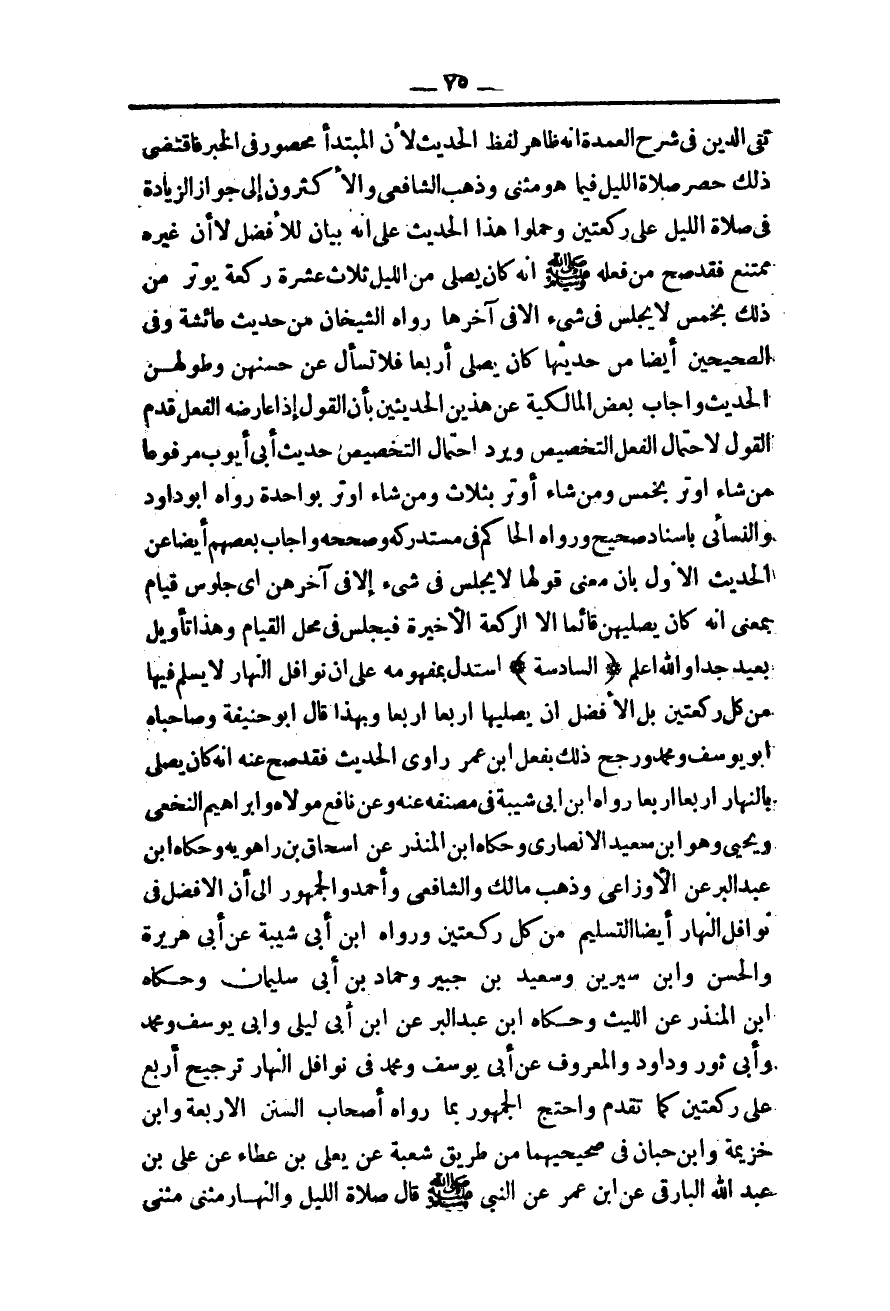 ـــــــــــــــــــــــــــــQفِي شَرْحِ الْعُمْدَةِ إنَّهُ ظَاهِرُ لَفْظِ الْحَدِيثِ لِأَنَّ الْمُبْتَدَأَ مَحْصُورٌ فِي الْخَبَرِ فَاقْتَضَى ذَلِكَ حَصْرُ صَلَاةِ اللَّيْلِ فِيمَا هُوَ مَثْنَى وَذَهَبَ الشَّافِعِيُّ وَالْأَكْثَرُونَ إلَى جَوَازِ الزِّيَادَةِ فِي صَلَاةِ اللَّيْلِ عَلَى رَكْعَتَيْنِ وَحَمَلُوا هَذَا الْحَدِيثَ عَلَى أَنَّهُ بَيَانٌ لِلْأَفْضَلِ لَا أَنَّ غَيْرَهُ مُمْتَنِعٌ فَقَدْ صَحَّ مِنْ فِعْلِهِ «- صَلَّى اللَّهُ عَلَيْهِ وَسَلَّمَ - إنَّهُ كَانَ يُصَلِّي مِنْ اللَّيْلِ ثَلَاثَ عَشْرَةَ رَكْعَةً يُوتِرُ مِنْ ذَلِكَ بِخَمْسٍ لَا يَجْلِسُ فِي شَيْءٍ إلَّا فِي آخِرِهَا» رَوَاهُ الشَّيْخَانِ مِنْ حَدِيثِ عَائِشَةَ وَفِي الصَّحِيحَيْنِ أَيْضًا مِنْ حَدِيثِهَا «كَانَ يُصَلِّي أَرْبَعًا فَلَا تَسْأَلْ عَنْ حُسْنِهِنَّ وَطُولِهِنَّ» الْحَدِيثَ وَأَجَابَ بَعْضُ الْمَالِكِيَّةِ عَنْ هَذَيْنِ الْحَدِيثَيْنِ بِأَنَّ الْقَوْلَ إذَا عَارَضَهُ الْفِعْلُ قُدِّمَ الْقَوْلُ لِاحْتِمَالِ الْفِعْلِ التَّخْصِيصَ وَيَرُدُّ احْتِمَالَ التَّخْصِيصِ حَدِيثُ أَبِي أَيُّوبَ مَرْفُوعًا «مَنْ شَاءَ أَوْتَرَ بِخَمْسٍ وَمَنْ شَاءَ أُوَتِّر بِثَلَاثٍ وَمَنْ شَاءَ أُوَتِّر بِوَاحِدَةٍ» رَوَاهُ أَبُو دَاوُد وَالنَّسَائِيُّ بِإِسْنَادٍ صَحِيحٍ وَرَوَاهُ الْحَاكِمُ فِي مُسْتَدْرَكِهِ وَصَحَّحَهُ وَأَجَابَ بَعْضُهُمْ أَيْضًا عَنْ الْحَدِيثِ الْأَوَّلِ بِأَنَّ مَعْنَى قَوْلِهَا لَا يَجْلِسُ فِي شَيْءٍ إلَّا فِي آخِرِهِنَّ أَيْ جُلُوسَ قِيَامٍ بِمَعْنَى أَنَّهُ كَانَ يُصَلِّيهِنَّ قَائِمًا إلَّا الرَّكْعَةَ الْأَخِيرَةَ فَيَجْلِسُ فِي مَحَلِّ الْقِيَامِ وَهَذَا تَأْوِيلٌ بَعِيدٌ جِدًّا وَاَللَّهُ أَعْلَمُ.