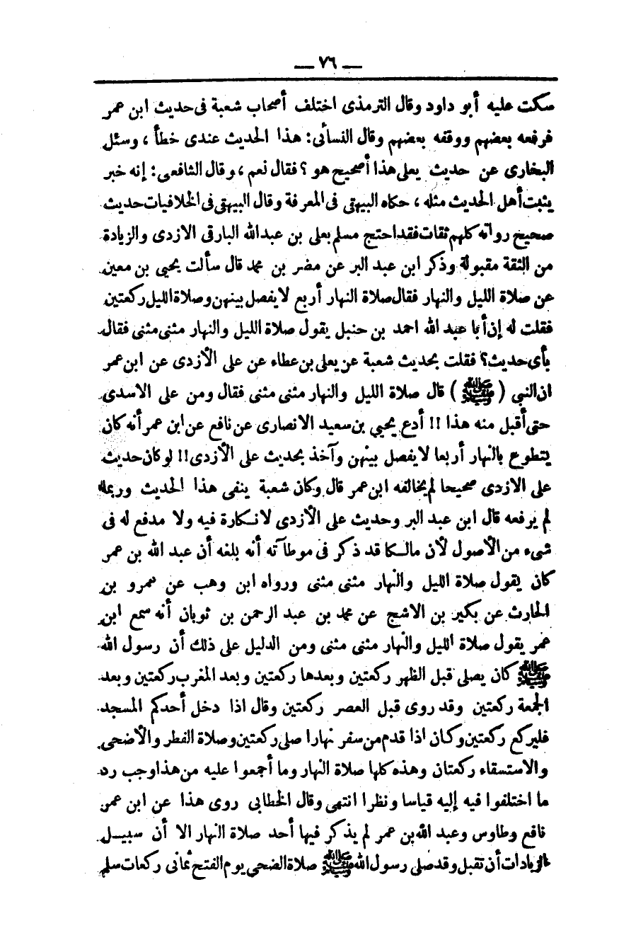 وَقَالَ الشَّافِعِيُّ: إنَّهُ خَبَرٌ يُثْبِتُ أَهْلُ الْحَدِيثِ مِثْلَهُ، حَكَاهُ الْبَيْهَقِيُّ فِي الْمَعْرِفَةِ وَقَالَ الْبَيْهَقِيُّ فِي الْخِلَافِيَّاتِ حَدِيثٌ صَحِيحٌ رُوَاتُهُ كُلُّهُمْ ثِقَاتٌ فَقَدْ احْتَجَّ مُسْلِمٌ بِعَلِيِّ بْنِ عَبْدِ اللَّهِ الْبَارِقِيِّ الْأَزْدِيِّ وَالزِّيَادَةُ مِنْ الثِّقَةِ مَقْبُولَةٌ وَذَكَرَ ابْنُ عَبْدِ الْبَرِّ عَنْ مُضَرَ بْنِ مُحَمَّدٍ قَالَ سَأَلَتْ يَحْيَى بْنَ مَعِينٍ عَنْ صَلَاةِ اللَّيْلِ وَالنَّهَارِ فَقَالَ صَلَاةُ النَّهَارِ أَرْبَعٌ لَا يَفْصِلُ بَيْنَهُنَّ وَصَلَاةُ اللَّيْلِ رَكْعَتَيْنِ فَقُلْت لَهُ إنَّ أَبَا عَبْدِ اللَّهِ أَحْمَدَ بْنَ حَنْبَلٍ يَقُولُ صَلَاةُ اللَّيْلِ وَالنَّهَارِ مَثْنَى مَثْنَى فَقَالَ بِأَيِّ حَدِيثٍ؟ فَقُلْت بِحَدِيثِ شُعْبَةَ عَنْ يَعْلَى بْنِ عَطَاءٍ عَنْ عَلِيٍّ الْأَزْدِيِّ عَنْ ابْنِ عُمَرَ أَنَّ النَّبِيَّ - صَلَّى اللَّهُ عَلَيْهِ وَسَلَّمَ - قَالَ «صَلَاةُ اللَّيْلِ وَالنَّهَارِ مَثْنَى مَثْنَى» فَقَالَ وَمَنْ عَلِيٌّ الْأَسَدِيُّ حَتَّى أَقْبَلَ مِنْهُ هَذَا،، أَدَعُ يَحْيَى بْنَ سَعِيدٍ الْأَنْصَارِيَّ عَنْ نَافِعٍ عَنْ ابْنِ عُمَرَ أَنَّهُ كَانَ يَتَطَوَّعُ بِالنَّهَارِ أَرْبَعًا لَا يَفْصِلُ بَيْنَهُنَّ وَآخُذُ بِحَدِيثِ عَلِيٍّ الْأَزْدِيِّ،، لَوْ كَانَ حَدِيثُ عَلِيٍّ الْأَزْدِيِّ صَحِيحًا لَمْ يُخَالِفْهُ ابْنُ عُمَرَ قَالَ وَكَانَ شُعْبَةُ يَنْفِي هَذَا الْحَدِيثَ وَرُبَّمَا لَمْ يَرْفَعْهُ قَالَ ابْنُ عَبْدِ الْبَرِّ وَحَدِيثُ عَلِيٍّ الْأَزْدِيِّ لَا نَكَارَةَ فِيهِ وَلَا مَدْفَعَ لَهُ فِي شَيْءٍ مِنْ الْأُصُولِ لِأَنَّ مَالِكًا قَدْ ذَكَرَ فِي مُوَطَّآتِهِ أَنَّهُ بَلَغَهُ أَنَّ عَبْدَ اللَّهَ بْنَ عُمَرَ كَانَ يَقُولُ صَلَاةُ اللَّيْلِ وَالنَّهَارِ مَثْنَى مَثْنَى وَرَوَاهُ ابْنُ وَهْبٍ عَنْ عَمْرِو بْنِ الْحَارِثِ عَنْ بُكَيْر بْنِ الْأَشَجِّ عَنْ مُحَمَّدِ بْنِ عَبْدِ الرَّحْمَنِ بْنِ ثَوْبَانَ أَنَّهُ سَمِعَ ابْنَ عُمَرَ يَقُولُ صَلَاةُ اللَّيْلِ وَالنَّهَارِ مَثْنَى مَثْنَى وَمِنْ الدَّلِيلِ عَلَى ذَلِكَ «أَنَّ رَسُولَ اللَّهِ - صَلَّى اللَّهُ عَلَيْهِ وَسَلَّمَ - كَانَ يُصَلِّي قَبْلَ الظُّهْرِ رَكْعَتَيْنِ وَبَعْدَهَا رَكْعَتَيْنِ وَبَعْدَ الْمَغْرِبِ رَكْعَتَيْنِ وَبَعْدَ الْجُمُعَةِ رَكْعَتَيْنِ» وَقَدْ رُوِيَ «قَبْلَ الْعَصْرِ رَكْعَتَيْنِ» وَقَالَ «إذَا دَخَلَ أَحَدُكُمْ الْمَسْجِدَ فَلْيَرْكَعْ رَكْعَتَيْنِ» .