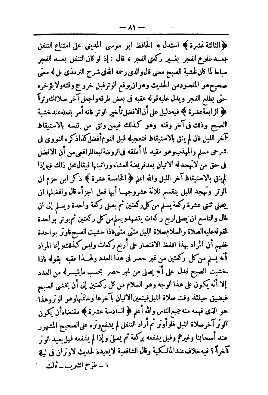 ـــــــــــــــــــــــــــــQالثَّالِثَةَ عَشْرَةَ) اسْتَدَلَّ بِهِ الْحَافِظُ أَبُو مُوسَى الْمَدِينِيُّ عَلَى امْتِنَاعِ التَّنَفُّلِ بَعْدَ طُلُوعِ الْفَجْرِ بِغَيْرِ رَكْعَتَيْ الْفَجْرِ، قَالَ: إذْ لَوْ كَانَ التَّنَفُّلُ بَعْدَ الْفَجْرِ مُبَاحًا لَمَا كَانَ لِخَشْيَةِ الصُّبْحِ مَعْنًى قَالَ وَالِدِي - رَحِمَهُ اللَّهُ - فِي شَرْحِ التِّرْمِذِيِّ بَلْ لَهُ مَعْنًى صَحِيحٌ هُوَ الْمَقْصُودُ مِنْ الْحَدِيثِ وَهُوَ أَنْ يُوقِعَ الْوِتْرَ قَبْلَ خُرُوجِ وَقْتِهِ وَلَا يُؤَخِّرَهُ حَتَّى يَطْلُعَ الْفَجْرُ وَيَدُلُّ عَلَيْهِ قَوْلُهُ عَقِبَهُ فِي بَعْضِ طُرُقِهِ «وَاجْعَلْ آخَرَ صَلَاتِك وِتْرًا» .