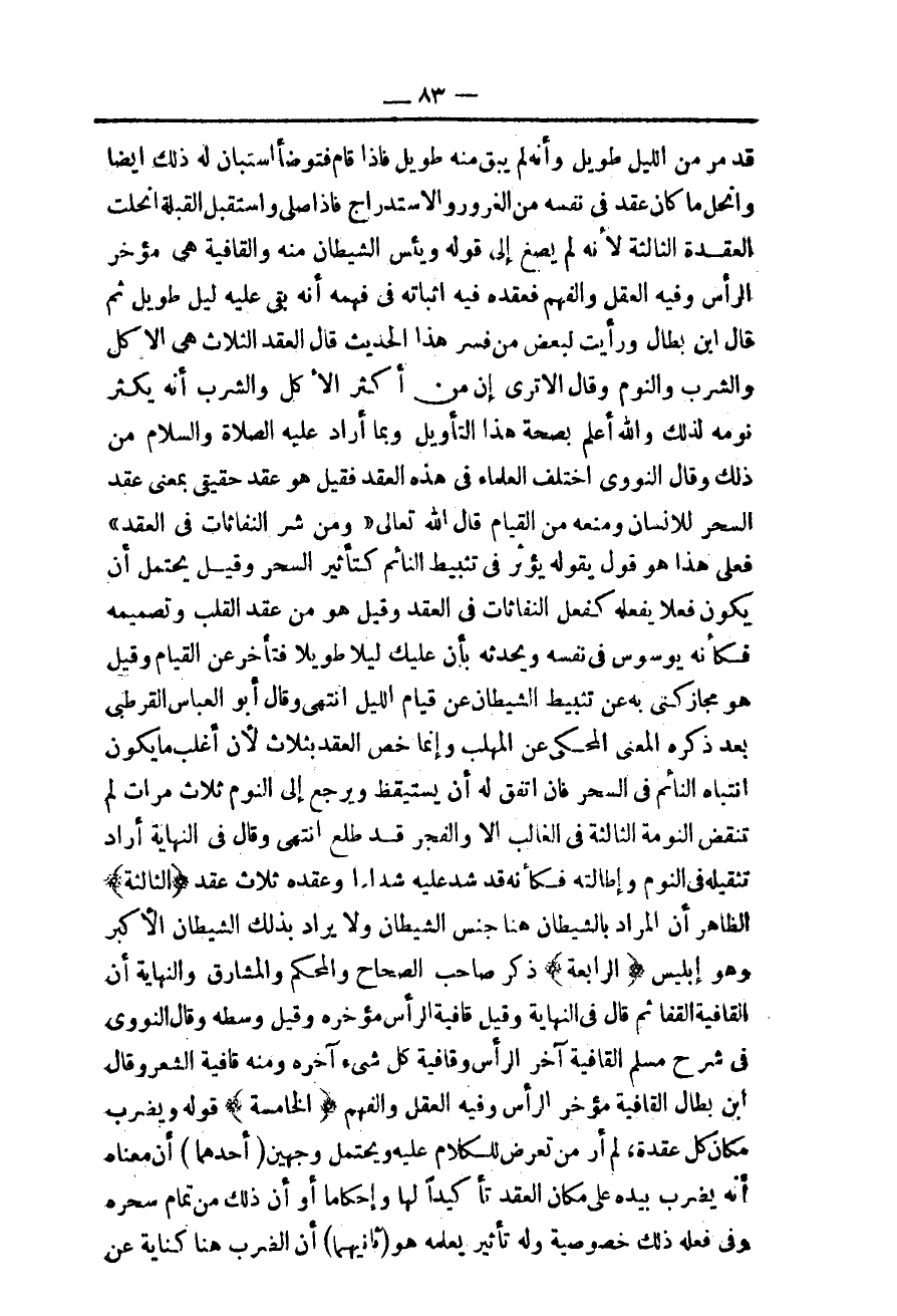 وَقَالَ أَبُو الْعَبَّاسِ الْقُرْطُبِيُّ بَعْدَ ذِكْرِهِ الْمَعْنَى الْمَحْكِيَّ عَنْ الْمُهَلَّبِ وَإِنَّمَا خَصَّ الْعُقَدَ بِثَلَاثٍ لِأَنَّ أَغْلَبَ مَا يَكُونُ انْتِبَاهُ النَّائِمِ فِي السَّحَرِ فَإِنْ اتَّفَقَ لَهُ أَنْ يَسْتَيْقِظَ وَيَرْجِعَ إلَى النَّوْمِ ثَلَاثَ مَرَّاتٍ لَمْ تُنْقَضْ النَّوْمَةُ الثَّالِثَةُ فِي الْغَالِبِ إلَّا وَالْفَجْرُ قَدْ طَلَعَ انْتَهَى.