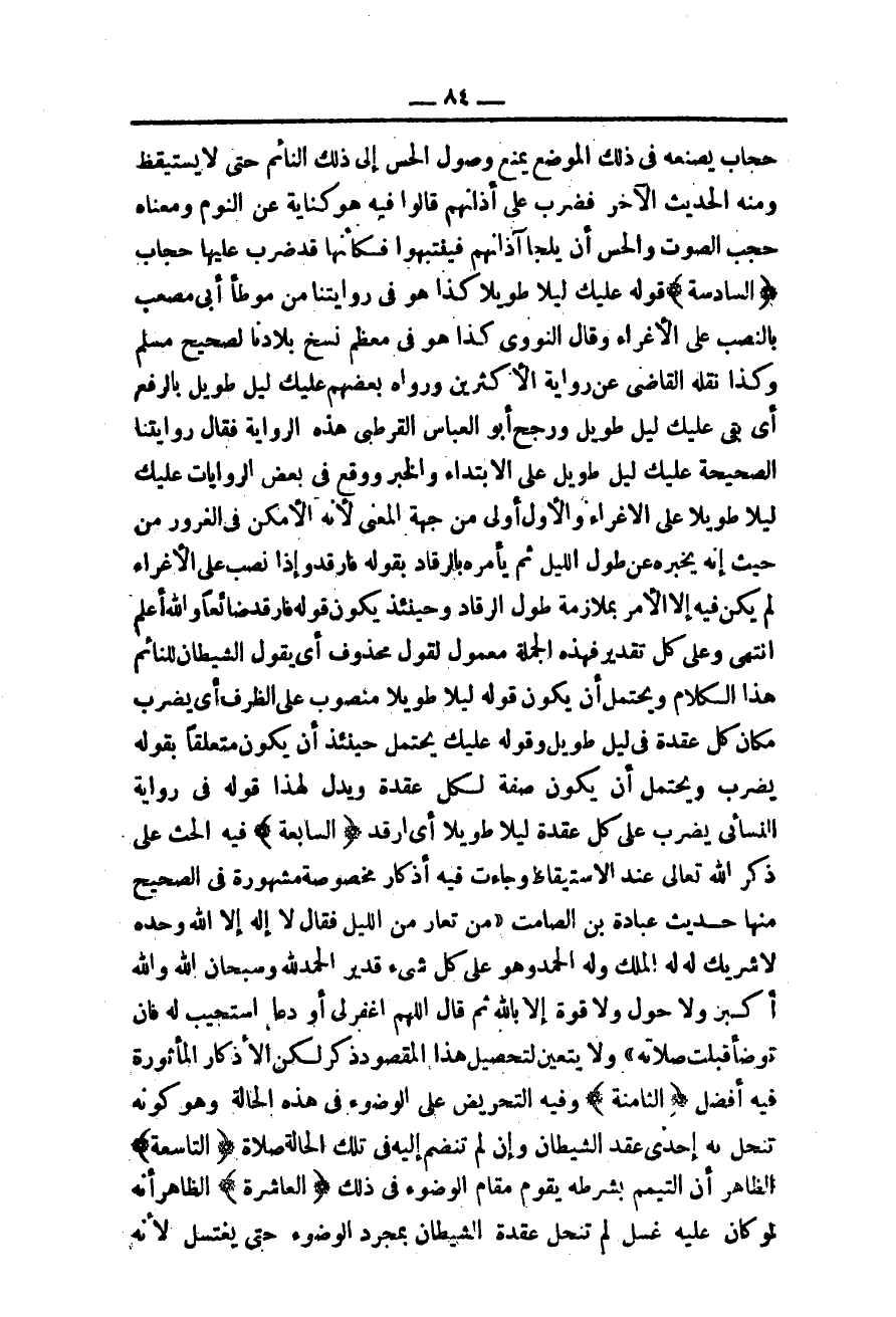 (السَّادِسَةُ) قَوْلُهُ «عَلَيْك لَيْلًا طَوِيلًا» كَذَا هُوَ فِي رِوَايَتِنَا مِنْ مُوَطَّإِ أَبُو مُصْعَبٍ بِالنَّصْبِ عَلَى الْإِغْرَاءِ وَقَالَ النَّوَوِيُّ كَذَا هُوَ فِي مُعْظَمِ نُسَخِ بِلَادِنَا لِصَحِيحِ مُسْلِمٍ وَكَذَا نَقَلَهُ الْقَاضِي عَنْ رِوَايَةِ الْأَكْثَرِينَ وَرَوَاهُ بَعْضُهُمْ «عَلَيْك لَيْلٌ طَوِيلٌ» بِالرَّفْعِ أَيْ بَقِيَ عَلَيْك لَيْلٌ طَوِيلٌ وَرَجَّحَ أَبُو الْعَبَّاسِ الْقُرْطُبِيُّ هَذِهِ الرِّوَايَةَ فَقَالَ رِوَايَتُنَا الصَّحِيحَةُ عَلَيْك لَيْلٌ طَوِيلٌ عَلَى الِابْتِدَاءِ وَالْخَبَرِ وَوَقَعَ فِي بَعْضِ الرِّوَايَاتِ «عَلَيْك لَيْلًا طَوِيلًا» عَلَى الْإِغْرَاءِ وَالْأَوَّلُ أَوْلَى مِنْ جِهَةِ الْمَعْنَى لِأَنَّهُ الْأَمْكَنُ فِي الْغُرُورِ مِنْ حَيْثُ إنَّهُ يُخْبِرُهُ عَنْ طُولِ اللَّيْلِ ثُمَّ يَأْمُرُهُ بِالرُّقَادِ بِقَوْلِهِ فَارْقُدْ وَإِذَا نُصِبْ عَلَى الْأَغْرَاءِ لَمْ يَكُنْ فِيهِ إلَّا الْأَمْرُ بِمُلَازَمَةِ طُولِ الرُّقَادِ وَحِينَئِذٍ يَكُونُ قَوْلُهُ فَارْقُدْ ضَائِعًا وَاَللَّهُ أَعْلَمُ انْتَهَى وَعَلَى كُلِّ تَقْدِيرٍ فَهَذِهِ الْجُمْلَةُ مَعْمُولٌ لِقَوْلٍ مَحْذُوفٍ أَيْ يَقُولُ الشَّيْطَانُ لِلنَّائِمِ هَذَا الْكَلَامَ وَيَحْتَمِلُ أَنْ يَكُونَ قَوْلُهُ لَيْلًا طَوِيلًا مَنْصُوبٌ عَلَى الظَّرْفِ أَيْ يَضْرِبُ مَكَانَ كُلِّ عُقْدَةٍ فِي لَيْلٍ طَوِيلٍ وَقَوْلُهُ عَلَيْك يَحْتَمِلُ حِينَئِذٍ أَنْ يَكُونَ مُتَعَلِّقًا بِقَوْلِهِ يَضْرِبُ وَيَحْتَمِلُ أَنْ يَكُونَ صِفَةً لِكُلِّ عُقْدَةٍ وَيَدُلُّ لِهَذَا قَوْلُهُ فِي رِوَايَةِ النَّسَائِيّ «يَضْرِبُ عَلَى كُلِّ عُقْدَةٍ لَيْلًا طَوِيلًا» أَيْ اُرْقُدْ