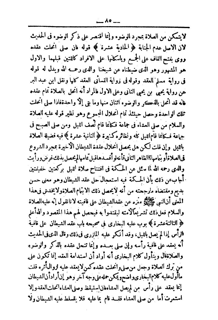 (الثَّالِثَةَ عَشْرَةَ) بَوَّبَ عَلَيْهِ الْبُخَارِيُّ فِي صَحِيحِهِ بَابُ عَقْدِ الشَّيْطَانُ عَلَى قَافِيَةِ الرَّأْسِ إذَا لَمْ يُصَلِّ بِاللَّيْلِ، وَقَدْ أَنْكَرَ عَلَيْهِ الْمَازِرِيُّ فِي ذَلِكَ وَقَالَ الَّذِي فِي الْحَدِيثِ أَنَّهُ يَعْقِدُ عَلَى قَافِيَةِ رَأْسِهِ وَإِنْ صَلَّى بَعْدَهُ وَإِنَّمَا تَنْحَلُّ عُقَدُهُ بِالذِّكْرِ وَالْوُضُوءِ وَالصَّلَاةِ قَالَ وَيُتَأَوَّلُ كَلَامُ الْبُخَارِيِّ أَنَّهُ أَرَادَ أَنَّ اسْتِدَامَةَ الْعَقْدِ إنَّمَا تَكُونُ عَلَى مَنْ تَرَكَ الصَّلَاةَ وَجَعَلَ مَنْ صَلَّى وَانْحَلَّتْ عُقَدُهُ كَمَنْ لَا يُعْقَدُ عَلَيْهِ لِزَوَالِ أَثَرِهِ قُلْت مَا أُوِّلَ عَلَيْهِ كَلَامُ الْبُخَارِيِّ وَاضِحٌ وَيُمْكِنُ حَمْلُهُ عَلَى وَجْهٍ آخَرَ وَهُوَ إنْ أَرَادَ أَنَّ الشَّيْطَانَ إنَّمَا يَعْقِدُ عَلَى رَأْسِ مَنْ لَمْ يُصَلِّ الْعِشَاءَ فَإِنْ اسْتَيْقَظَ وَصَلَّى الْعِشَاءَ انْحَلَّتْ الْعُقَدُ وَإِلَّا اسْتَمَرَّتْ أَمَّا مَنْ صَلَّى الْعِشَاءَ فَقَدْ قَامَ بِمَا عَلَيْهِ فَلَا يَتَسَلَّطُ عَلَيْهِ الشَّيْطَانُ وَلَا