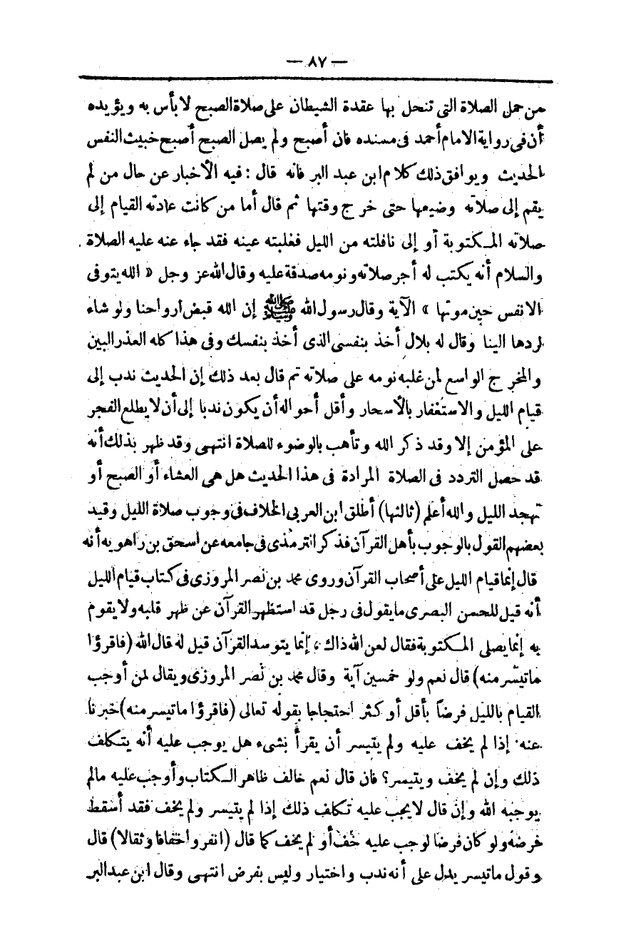 ـــــــــــــــــــــــــــــQمِنْ حَمْلِ الصَّلَاةِ الَّتِي تَنْحَلُّ بِهَا عُقْدَةُ الشَّيْطَانُ عَلَى صَلَاةِ الصُّبْحِ لَا بَأْسَ بِهِ وَيُؤَيِّدُهُ أَنَّ فِي رِوَايَةِ الْإِمَامِ أَحْمَدَ فِي مُسْنَدِهِ «فَإِنْ أَصْبَحَ وَلَمْ يُصَلِّ الصُّبْحَ أَصْبَحَ خَبِيثَ النَّفْسِ» الْحَدِيثَ وَيُوَافِقُ ذَلِكَ كَلَامَ ابْنِ عَبْدِ الْبَرِّ فَإِنَّهُ قَالَ: فِيهِ الْإِخْبَارُ عَنْ حَالِ مَنْ لَمْ يَقُمْ إلَى صَلَاتِهِ وَضَيَّعَهَا حَتَّى خَرَجَ وَقْتُهَا ثُمَّ قَالَ أَمَّا مَنْ كَانَتْ عَادَتُهُ الْقِيَامُ إلَى صَلَاتِهِ الْمَكْتُوبَةِ أَوْ إلَى نَافِلَتِهِ مِنْ اللَّيْلِ فَغَلَبَتْهُ عَيْنُهُ فَقَدْ جَاءَ عَنْهُ - عَلَيْهِ الصَّلَاةُ وَالسَّلَامُ - «أَنَّهُ يُكْتَبُ لَهُ أَجْرُ صَلَاتِهِ وَنَوْمِهِ صَدَقَةً عَلَيْهِ» وَقَالَ اللَّهُ عَزَّ وَجَلَّ {اللَّهُ يَتَوَفَّى الأَنْفُسَ حِينَ مَوْتِهَا} [الزمر: 42] الْآيَةَ وَقَالَ رَسُولُ اللَّهِ - صَلَّى اللَّهُ عَلَيْهِ وَسَلَّمَ - «إنَّ اللَّهَ قَبَضَ أَرْوَاحَنَا وَلَوْ شَاءَ لَرَدَّهَا إلَيْنَا وَقَالَ لَهُ بِلَالٌ أَخَذَ بِنَفْسِي الَّذِي أَخَذَ بِنَفْسِك» وَفِي هَذَا كُلِّهِ الْعُذْرُ الْبَيِّنُ وَالْمَخْرَجُ الْوَاسِعُ لِمَنْ غَلَبَهُ نَوْمُهُ عَلَى صَلَاتِهِ ثُمَّ قَالَ بَعْدَ ذَلِكَ إنَّ الْحَدِيثَ نَدَبَ إلَى قِيَامِ اللَّيْلِ وَالِاسْتِغْفَارِ بِالْأَسْحَارِ وَأَقَلُّ أَحْوَالِهِ أَنْ يَكُونَ نَدْبًا إلَى أَنْ لَا يَطْلُعَ الْفَجْرُ عَلَى الْمُؤْمِنِ إلَّا وَقَدْ ذَكَرَ اللَّهَ وَتَأَهَّبَ بِالْوُضُوءِ لِلصَّلَاةِ انْتَهَى.