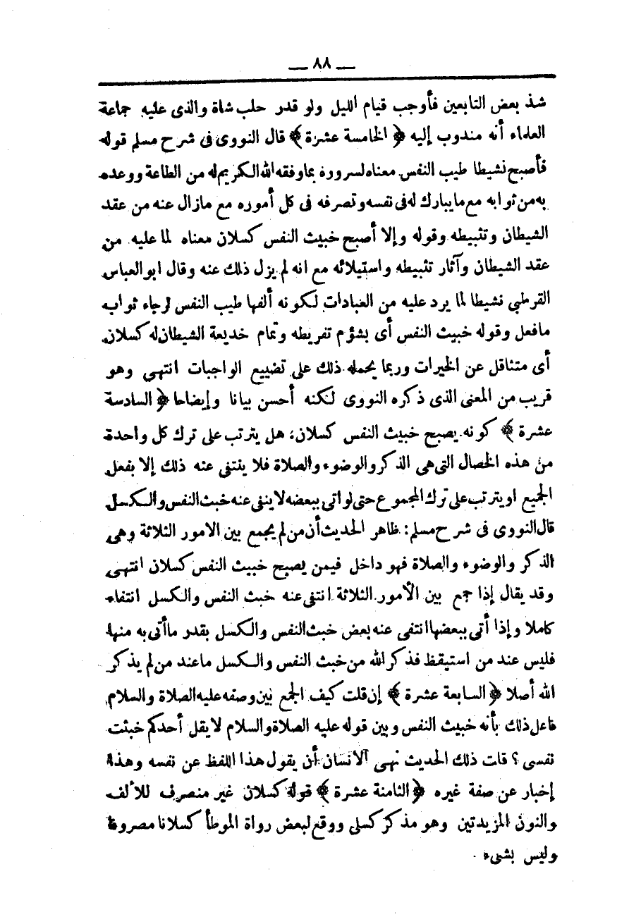 (السَّادِسَةَ عَشْرَةَ) كَوْنُهُ يُصْبِحُ خَبِيثَ النَّفْسِ كَسْلَانَ، هَلْ يَتَرَتَّبُ عَلَى تَرْكِ كُلِّ وَاحِدَةٍ مِنْ هَذِهِ الْخِصَالِ الَّتِي هِيَ الذِّكْرُ وَالْوُضُوءُ وَالصَّلَاةُ فَلَا يَنْتَفِي عَنْهُ ذَلِكَ إلَّا بِفِعْلِ الْجَمِيعِ أَوْ يَتَرَتَّبُ عَلَى تَرْكِ الْمَجْمُوعِ حَتَّى لَوْ أَتَى بِبَعْضِهِ لَا يَنْفِي عَنْهُ خَبُثَ النَّفْسِ وَالْكَسَلَ قَالَ النَّوَوِيُّ فِي شَرْحِ مُسْلِمٍ: ظَاهِرُ الْحَدِيثِ أَنَّ مَنْ لَمْ يَجْمَعْ بَيْنَ الْأُمُورِ الثَّلَاثَةِ وَهِيَ الذِّكْرُ وَالْوُضُوءُ وَالصَّلَاةُ فَهُوَ دَاخِلٌ فِيمَنْ يُصْبِحُ خَبِيثَ النَّفْسِ كَسْلَانَ انْتَهَى.