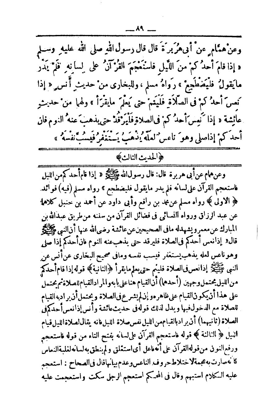 الْحَدِيثُ الثَّالِثُ) وَعَنْ هَمَّامٍ عَنْ أَبِي هُرَيْرَةَ قَالَ: قَالَ رَسُولُ اللَّهِ - صَلَّى اللَّهُ عَلَيْهِ وَسَلَّمَ - «إذَا قَامَ أَحَدُكُمْ مِنْ اللَّيْلِ فَاسْتَعْجَمَ الْقُرْآنُ عَلَى لِسَانِهِ فَلَمْ يَدْرِ مَا يَقُولُ فَلْيَضْطَجِعْ» رَوَاهُ مُسْلِمٌ (فِيهِ) فَوَائِدُ: