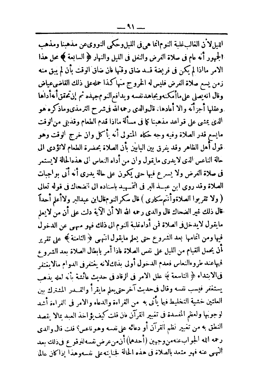 ـــــــــــــــــــــــــــــQاللَّيْلِ لِأَنَّ الْغَالِبَ غَلَبَةُ النَّوْمِ إنَّمَا هِيَ فِي اللَّيْلِ وَحَكَى النَّوَوِيُّ عَنْ مَذْهَبِنَا وَمَذْهَبِ الْجُمْهُورِ أَنَّهُ عَامٌّ فِي صَلَاةِ الْفَرْضِ وَالنَّفَلِ فِي اللَّيْلِ وَالنَّهَارِ.