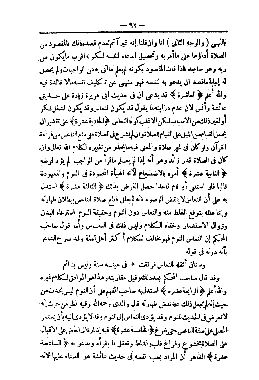 (الثَّالِثَةَ عَشْرَةَ) اُسْتُدِلَّ بِهِ عَلَى أَنَّ النُّعَاسَ لَا يَنْقُضُ الْوُضُوءَ فَإِنَّهُ لَمْ يُعَلِّلْ قَطْعَ صَلَاةِ النَّاعِسِ بِبُطْلَانِ طَهَارَتِهِ وَإِنَّمَا عَلَّلَهُ بِتَوَقُّعِ الْغَلَطِ مِنْهُ وَالنُّعَاسُ دُونَ النَّوْمِ وَحَقِيقَةُ النَّوْمِ اسْتِرْخَاءُ الْبَدَنِ وَزَوَالُ الِاسْتِشْعَارِ وَخَفَاءُ الْكَلَامِ وَلَيْسَ ذَلِكَ فِي النُّعَاسِ وَأَمَّا قَوْلُ صَاحِبِ الْمُحْكَمِ إنَّ النُّعَاسَ النَّوْمُ فَهُوَ مُخَالِفٌ لِكَلَامِ أَكْثَرِ أَهْلِ اللُّغَةِ وَقَدْ صَرَّحَ الشَّاعِرُ بِأَنَّهُ دُونَهُ فِي قَوْلِهِ