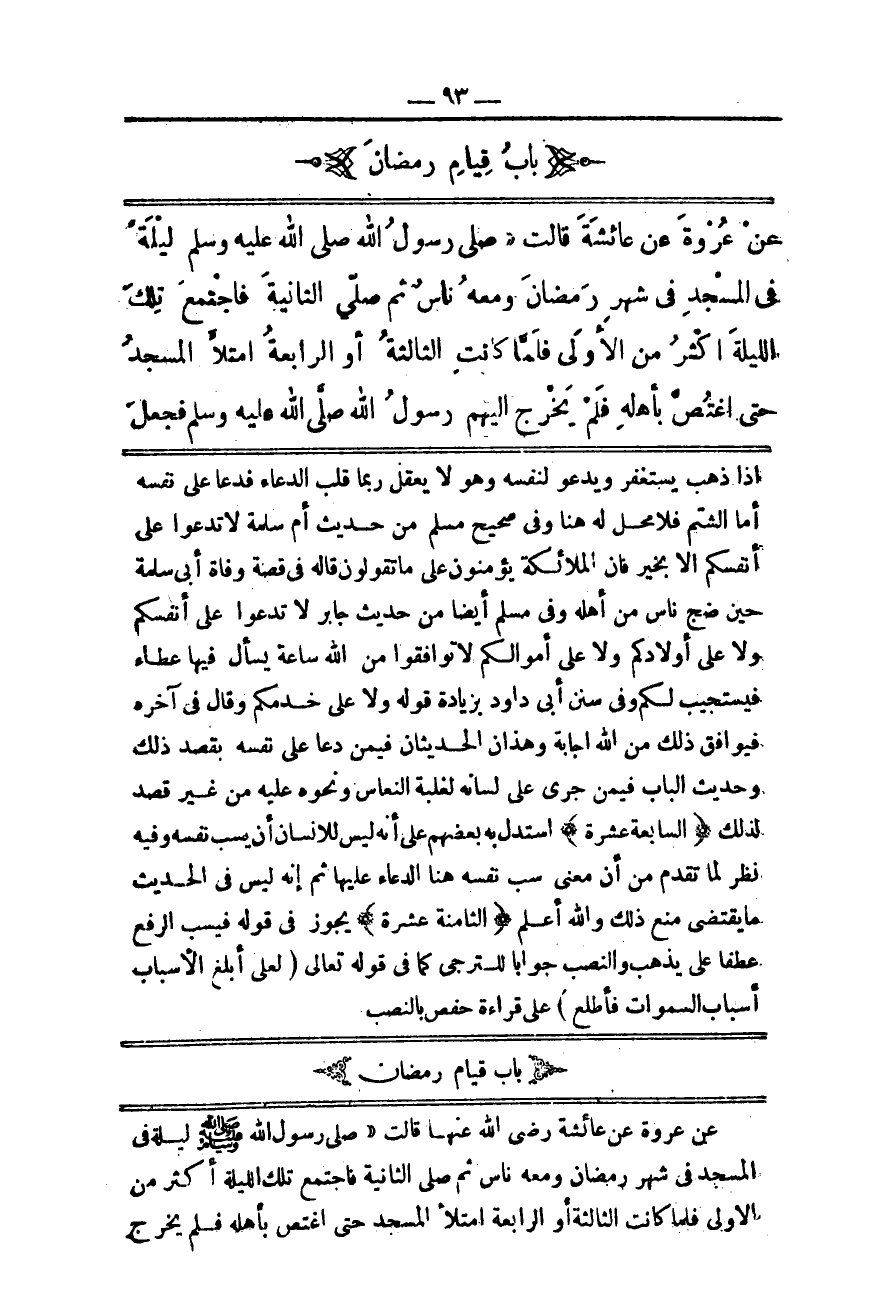 بَابُ قِيَامِ رَمَضَانَ عَنْ عُرْوَةَ عَنْ عَائِشَةَ قَالَتْ «صَلَّى رَسُولُ اللَّهِ - صَلَّى اللَّهُ عَلَيْهِ وَسَلَّمَ - لَيْلَةً فِي الْمَسْجِدِ فِي شَهْرِ رَمَضَانَ وَمَعَهُ نَاسٌ ثُمَّ صَلَّى الثَّانِيَةَ فَاجْتَمَعَ تِلْكَ اللَّيْلَةَ أَكْثَرُ مِنْ الْأُولَى فَلَمَّا كَانَتْ الثَّالِثَةُ أَوْ الرَّابِعَةُ امْتَلَأَ الْمَسْجِدُ حَتَّى اغْتَصَّ بِأَهْلِهِ فَلَمْ يَخْرُجْ إلَيْهِمْ رَسُولُ اللَّهِ - صَلَّى اللَّهُ عَلَيْهِ وَسَلَّمَ - فَجَعَلَ