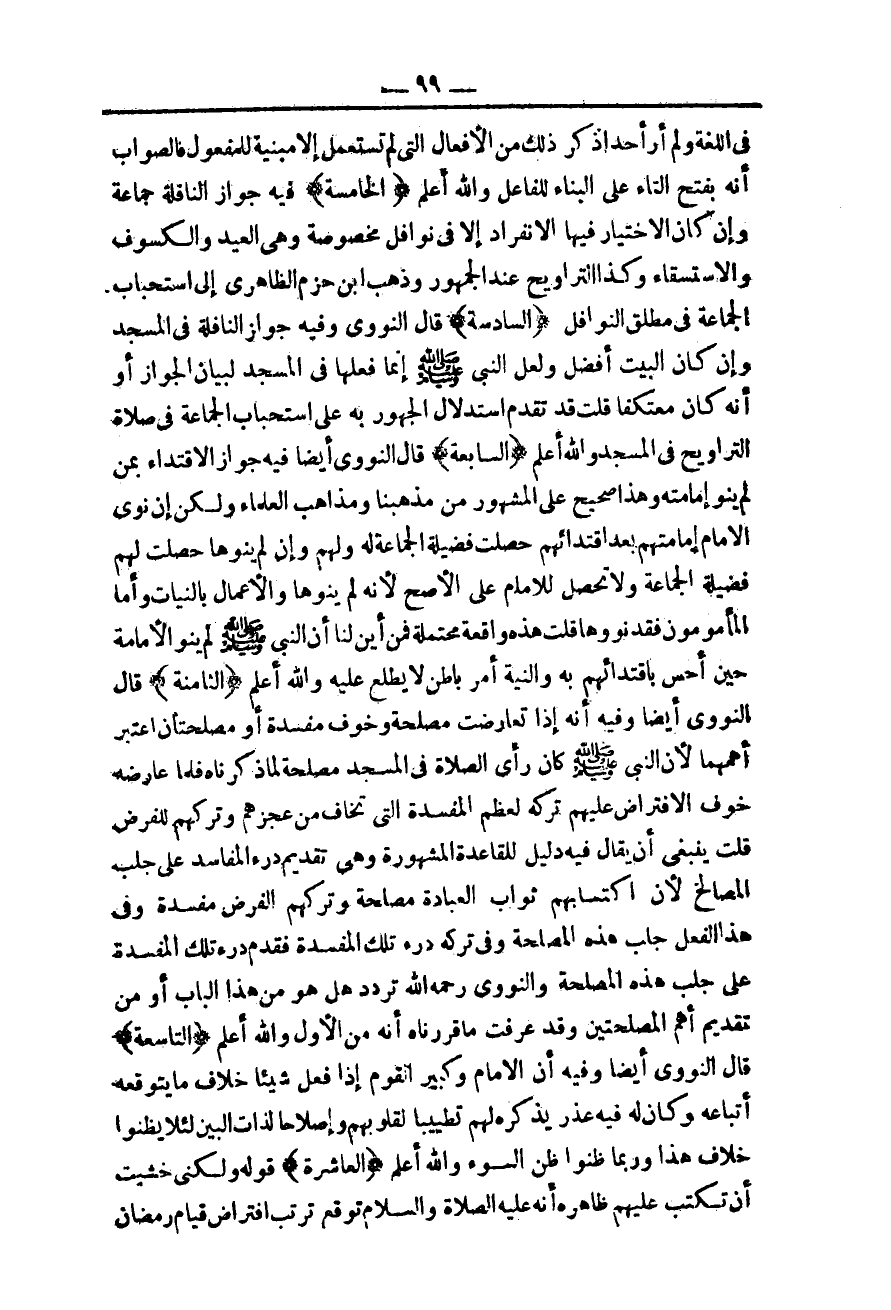 (الثَّامِنَةُ) قَالَ النَّوَوِيُّ أَيْضًا وَفِيهِ أَنَّهُ إذَا تَعَارَضَتْ مَصْلَحَةٌ وَخَوْفُ مَفْسَدَةٍ أَوْ مَصْلَحَتَانِ اُعْتُبِرَ أَهَمُّهُمَا لِأَنَّ النَّبِيَّ - صَلَّى اللَّهُ عَلَيْهِ وَسَلَّمَ - كَانَ رَأَى الصَّلَاةَ فِي الْمَسْجِدِ مَصْلَحَةً لِمَا ذَكَرْنَاهُ فَلَمَّا عَارَضَهُ خَوْفُ الِافْتِرَاضِ عَلَيْهِمْ تَرَكَهُ لِعِظَمِ الْمَفْسَدَةِ الَّتِي تُخَافُ مِنْ عَجْزِهِمْ وَتَرْكِهِمْ لِلْفَرْضِ قُلْت يَنْبَغِي أَنْ يُقَالَ فِيهِ دَلِيلٌ لِلْقَاعِدَةِ الْمَشْهُورَةِ وَهِيَ تَقْدِيمُ دَرْءِ الْمَفَاسِدِ عَلَى جَلْبِ الْمَصَالِحِ لِأَنَّ اكْتِسَابَهُمْ ثَوَابَ الْعِبَادَةِ مَصْلَحَةٌ وَتَرْكَهُمْ الْفَرْضَ مَفْسَدَةٌ وَفِي هَذَا الْفِعْلِ جَلْبُ هَذِهِ الْمَصْلَحَةِ وَفِي تَرْكِهِ دَرْءُ تِلْكَ الْمَفْسَدَةِ فَقُدِّمَ دَرْءُ تِلْكَ الْمَفْسَدَةِ عَلَى جَلْبِ هَذِهِ الْمَصْلَحَةِ وَالنَّوَوِيُّ - رَحِمَهُ اللَّهُ - تَرَدَّدَ هَلْ هُوَ مِنْ هَذَا الْبَابِ أَوْ مِنْ تَقْدِيمِ أَهَمِّ الْمَصْلَحَتَيْنِ وَقَدْ عَرَفْتَ مَا قَرَّرْنَاهُ أَنَّهُ مِنْ الْأَوَّلِ وَاَللَّهُ أَعْلَمُ.