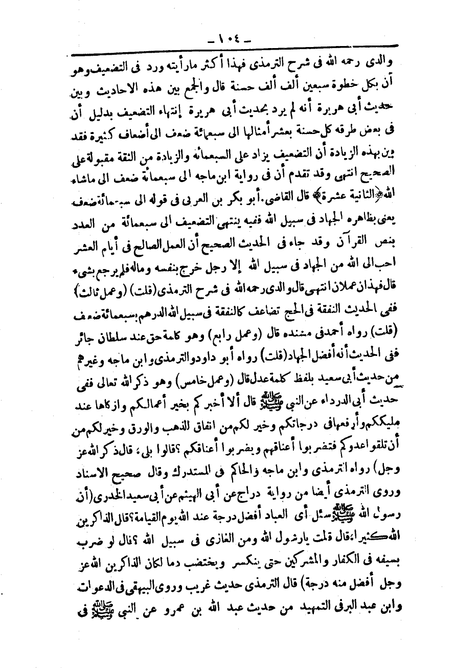 قَالَ وَالِدِي - رَحِمَهُ اللَّهُ - فِي شَرْحِ التِّرْمِذِيِّ (قُلْت) (وَعَمَلٌ ثَالِثٌ) فَفِي الْحَدِيثِ النَّفَقَةُ فِي الْحَجِّ تُضَاعَفُ كَالنَّفَقَةِ فِي سَبِيلِ اللَّهِ الدِّرْهَمُ بِسَبْعِمِائَةِ ضِعْفٍ (قُلْت) رَوَاهُ أَحْمَدُ فِي مُسْنَدِهِ قَالَ (وَعَمَلٌ رَابِعٌ) وَهُوَ كَلِمَةُ حَقٍّ عِنْدَ سُلْطَانٍ جَائِرٍ فَفِي الْحَدِيثِ أَنَّهُ أَفْضَلُ الْجِهَادِ (قُلْت) رَوَاهُ أَبُو دَاوُد وَالتِّرْمِذِيُّ وَابْنُ مَاجَهْ وَغَيْرُهُمْ مِنْ حَدِيثِ أَبِي سَعِيدٍ بِلَفْظِ كَلِمَةُ عَدْلٍ قَالَ (وَعَمَلٌ خَامِسٌ) وَهُوَ ذِكْرُ اللَّهِ تَعَالَى فَفِي حَدِيثِ أَبِي الدَّرْدَاءِ عَنْ النَّبِيِّ - صَلَّى اللَّهُ عَلَيْهِ وَسَلَّمَ - قَالَ «أَلَا أُخْبِرُكُمْ بِخَيْرِ أَعْمَالِكُمْ وَأَزْكَاهَا عِنْدَ مَلِيكِكُمْ وَأَرْفَعِهَا فِي دَرَجَاتِكُمْ وَخَيْرٌ لَكُمْ مِنْ إنْفَاقِ الذَّهَبِ وَالْوَرِقِ وَخَيْرٌ لَكُمْ مِنْ أَنْ تَلْقَوْا عَدُوَّكُمْ فَتَضْرِبُوا أَعْنَاقَهُمْ وَيَضْرِبُوا أَعْنَاقَكُمْ؟ قَالُوا بَلَى، قَالَ ذِكْرُ اللَّهِ عَزَّ وَجَلَّ» رَوَاهُ التِّرْمِذِيُّ وَابْنُ مَاجَهْ وَالْحَاكِمُ فِي الْمُسْتَدْرَكِ، وَقَالَ صَحِيحُ الْإِسْنَادِ