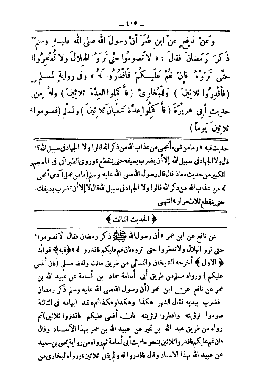 وَعَنْ نَافِعٍ عَنْ ابْنِ عُمَرَ أَنَّ رَسُولَ اللَّهِ - صَلَّى اللَّهُ عَلَيْهِ وَسَلَّمَ - ذَكَرَ رَمَضَانَ فَقَالَ: «لَا تَصُومُوا حَتَّى تَرَوْا الْهِلَالَ وَلَا تُفْطِرُوا حَتَّى تَرَوْهُ فَإِنْ غُمَّ عَلَيْكُمْ فَاقْدِرُوا لَهُ» وَفِي رِوَايَةٍ لِمُسْلِمٍ «فَأَقْدِرُوا ثَلَاثِينَ» وَلِلْبُخَارِيِّ «فَأَكْمِلُوا الْعِدَّةَ ثَلَاثِينَ»