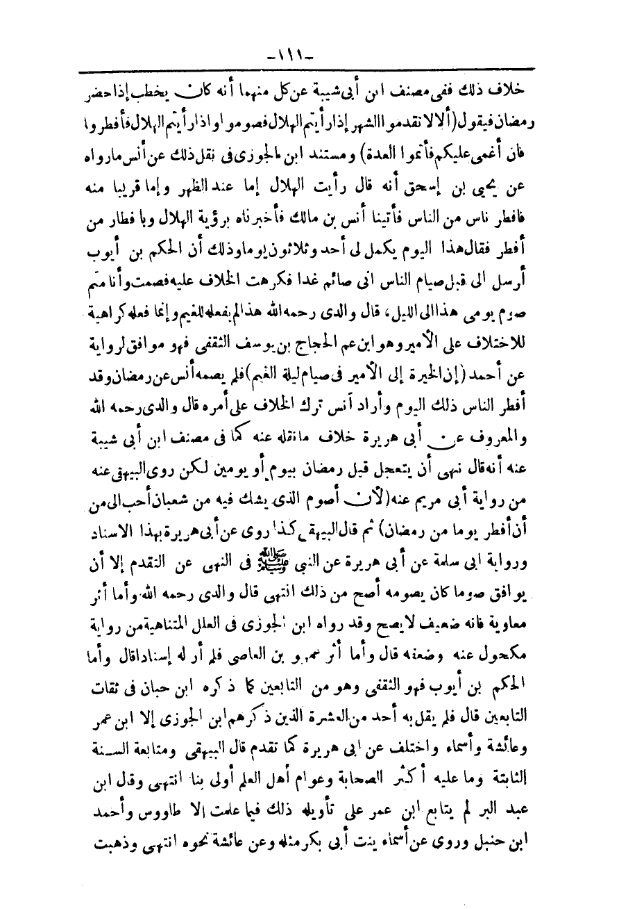 وَمُسْتَنَدُ ابْنِ الْجَوْزِيِّ فِي نَقْلِ ذَلِكَ عَنْ أَنَسٍ مَا رَوَاهُ عَنْ يَحْيَى بْنِ إِسْحَاقَ أَنَّهُ قَالَ رَأَيْت الْهِلَالَ إمَّا عِنْدَ الظُّهْرِ وَإِمَّا قَرِيبًا مِنْهُ فَأَفْطَرَ نَاسٌ مِنْ النَّاسِ فَأَتَيْنَا أَنَسَ بْنَ مَالِكٍ فَأَخْبَرْنَاهُ بِرُؤْيَةِ الْهِلَالِ وَبِإِفْطَارِ مَنْ أَفْطَرَ فَقَالَ هَذَا الْيَوْمُ يَكْمُلُ لِي أَحَدٌ وَثَلَاثُونَ يَوْمًا وَذَلِكَ أَنَّ الْحَكَمَ بْنَ أَيُّوبَ أَرْسَلَ إلَيَّ قَبْلَ صِيَامِ النَّاسِ إنِّي صَائِمٌ غَدًا فَكَرِهْت الْخِلَافَ عَلَيْهِ فَصُمْت وَأَنَا مُتِمٌّ صَوْمَ يَوْمِي هَذَا إلَى اللَّيْلِ، قَالَ وَالِدِيّ - رَحِمَهُ اللَّهُ - هَذَا لَمْ يَفْعَلْهُ لِلْغَيْمِ، وَإِنَّمَا فَعَلَهُ كَرَاهِيَةً لِلِاخْتِلَافِ عَلَى الْأَمِيرِ وَهُوَ ابْنُ عَمِّ الْحَجَّاجِ بْنِ يُوسُفَ الثَّقَفِيِّ فَهُوَ مُوَافِقٌ لِرِوَايَةٍ عَنْ أَحْمَدَ (إنَّ الْخِيَرَةَ إلَى الْأَمِيرِ فِي صِيَامِ لَيْلَةِ الْغَيْمِ) فَلَمْ يَصُمْهُ أَنَسٌ عَنْ رَمَضَانَ، وَقَدْ أَفْطَرَ النَّاسُ ذَلِكَ الْيَوْمَ وَأَرَادَ أَنَسٌ تَرْكَ الْخِلَافِ عَلَى أَمْرِهِ.