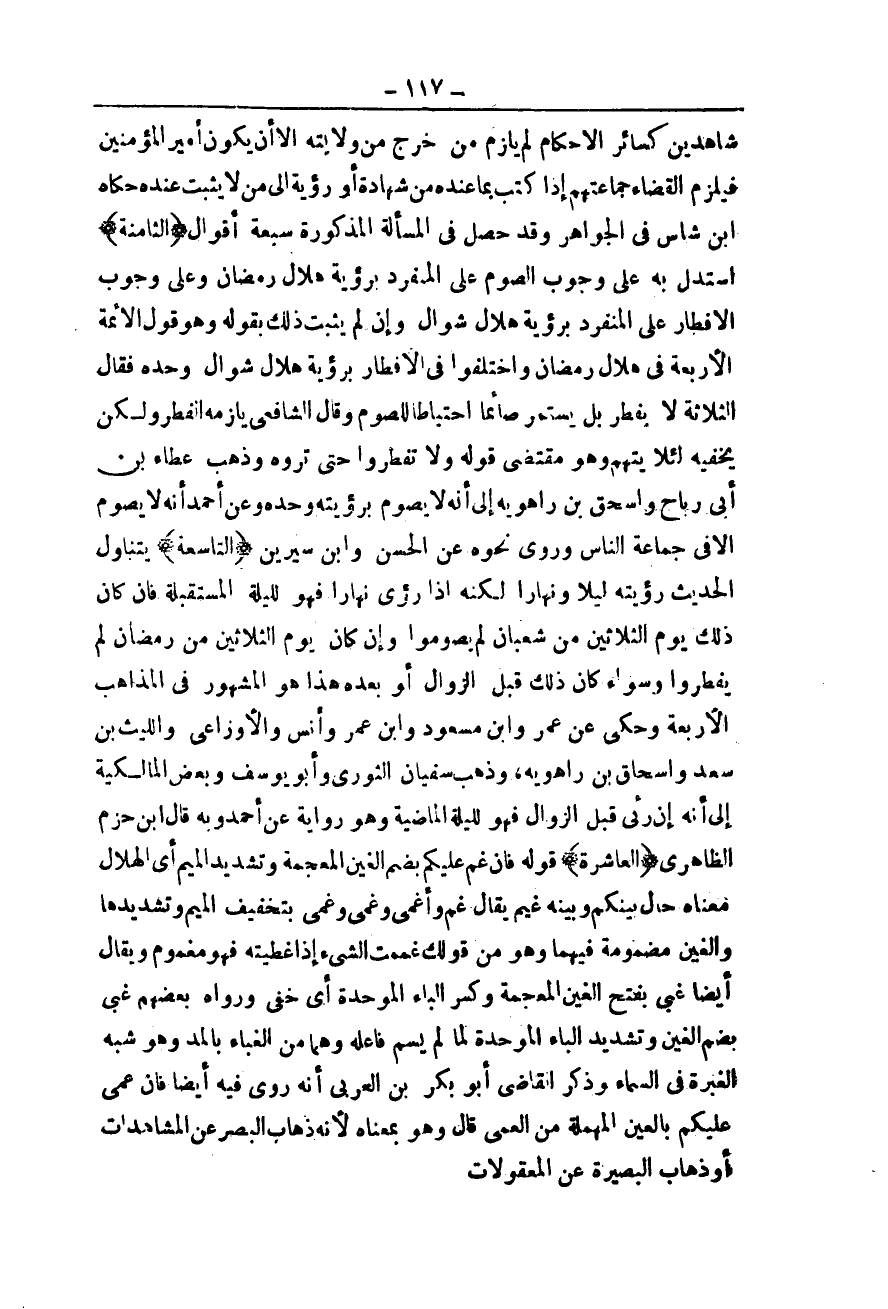 (التَّاسِعَةُ) يَتَنَاوَلُ الْحَدِيثُ رُؤْيَتَهُ لَيْلًا وَنَهَارًا لَكِنَّهُ إذَا رُئِيَ نَهَارًا فَهُوَ لِلَّيْلَةِ الْمُسْتَقْبَلَةِ فَإِنْ كَانَ ذَلِكَ يَوْمَ الثَّلَاثِينَ مِنْ شَعْبَانَ لَمْ يَصُومُوا وَإِنْ كَانَ يَوْمَ الثَّلَاثِينَ مِنْ رَمَضَانَ لَمْ يُفْطِرُوا وَسَوَاءٌ كَانَ ذَلِكَ قَبْلَ الزَّوَالِ أَوْ بَعْدَهُ هَذَا هُوَ الْمَشْهُورُ فِي الْمَذَاهِبِ الْأَرْبَعَةِ وَحُكِيَ عَنْ عُمَرَ وَابْنِ مَسْعُودٍ وَابْنِ عُمَرَ وَأَنَسٍ وَالْأَوْزَاعِيِّ وَاللَّيْثِ بْنِ سَعْدٍ وَإِسْحَاقَ بْنِ رَاهْوَيْهِ، وَذَهَبَ سُفْيَانُ الثَّوْرِيُّ وَأَبُو يُوسُفَ وَبَعْضُ الْمَالِكِيَّةِ إلَى أَنَّهُ إنْ رُئِيَ قَبْلَ الزَّوَالِ فَهُوَ لِلَّيْلَةِ الْمَاضِيَةِ وَهُوَ رِوَايَةٌ عَنْ أَحْمَدَ وَبِهِ قَالَ ابْنُ حَزْمٍ الظَّاهِرِيُّ.