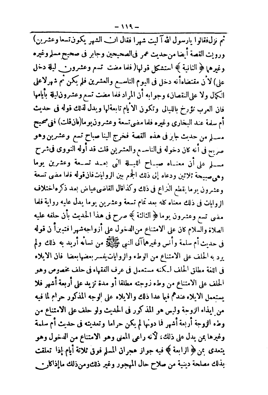 ـــــــــــــــــــــــــــــQثُمَّ نَزَلَ فَقَالُوا يَا رَسُولَ اللَّهِ آلَيْتَ شَهْرًا فَقَالَ إنَّ الشَّهْرَ يَكُونُ تِسْعًا وَعِشْرِينَ» وَرُوِيَتْ الْقِصَّةُ أَيْضًا مِنْ حَدِيثِ عُمَرَ فِي الصَّحِيحَيْنِ وَجَابِرٌ فِي صَحِيحِ مُسْلِمٍ وَغَيْرِهِ وَغَيْرِهِمَا.