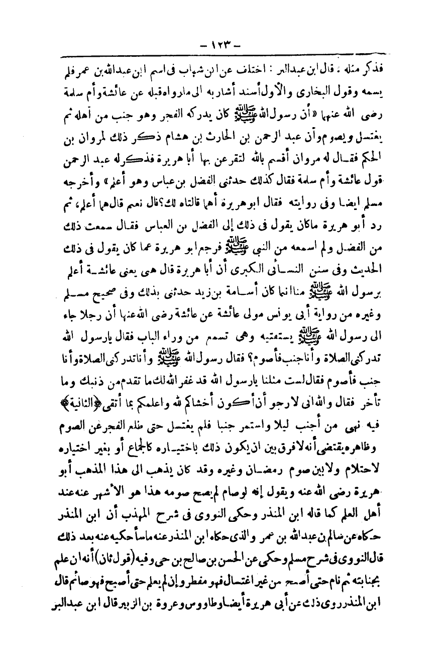 (الثَّانِيَةُ) فِيهِ نَهْيُ مَنْ أَجْنَبَ لَيْلًا وَاسْتَمَرَّ جُنُبًا فَلَمْ يَغْتَسِلْ حَتَّى طَلَعَ الْفَجْرُ عَنْ الصَّوْمِ وَظَاهِرُهُ يَقْتَضِي أَنَّهُ لَا فَرْقَ بَيْنَ أَنْ يَكُونَ ذَلِكَ بِاخْتِيَارِهِ كَالْجِمَاعِ أَوْ بِغَيْرِ اخْتِيَارِهِ لِاحْتِلَامٍ وَلَا بَيْنَ صَوْمِ رَمَضَانَ وَغَيْرِهِ، وَقَدْ كَانَ يَذْهَبُ إلَى هَذَا الْمَذْهَبِ أَبُو هُرَيْرَةَ - رَضِيَ اللَّهُ عَنْهُ - وَيَقُولُ إنَّهُ لَوْ صَامَ لَمْ يَصِحَّ صَوْمُهُ هَذَا هُوَ الْأَشْهَرُ عَنْهُ عِنْدَ أَهْلِ الْعِلْمِ كَمَا قَالَهُ ابْنُ الْمُنْذِرِ وَحَكَى النَّوَوِيُّ فِي شَرْحِ الْمُهَذَّبِ أَنَّ ابْنَ الْمُنْذِرِ حَكَاهُ عَنْ سَالِمِ بْنِ عَبْدِ اللَّهِ بْنِ عُمَرَ، وَاَلَّذِي حَكَاهُ ابْنُ الْمُنْذِرِ عَنْهُ مَا سَأَحْكِيهِ عَنْهُ بَعْدَ ذَلِكَ. قَالَ النَّوَوِيُّ فِي شَرْحِ مُسْلِمٍ وَحُكِيَ عَنْ الْحَسَنِ بْنِ صَالِحِ بْنِ حَيٍّ وَفِيهِ (قَوْلٌ ثَانٍ) أَنَّهُ إنْ عَلِمَ بِجَنَابَتِهِ ثُمَّ نَامَ حَتَّى أَصْبَحَ مِنْ غَيْرِ اغْتِسَالٍ فَهُوَ مُفْطِرٌ وَإِنْ لَمْ يَعْلَمْ حَتَّى أَصْبَحَ فَهُوَ صَائِمٌ قَالَ ابْنُ الْمُنْذِرِ رُوِيَ ذَلِكَ عَنْ أَبِي هُرَيْرَةَ أَيْضًا وَطَاوُسٍ وَعُرْوَةَ بْنِ الزُّبَيْرِ. قَالَ ابْنُ عَبْدِ الْبَرِّ