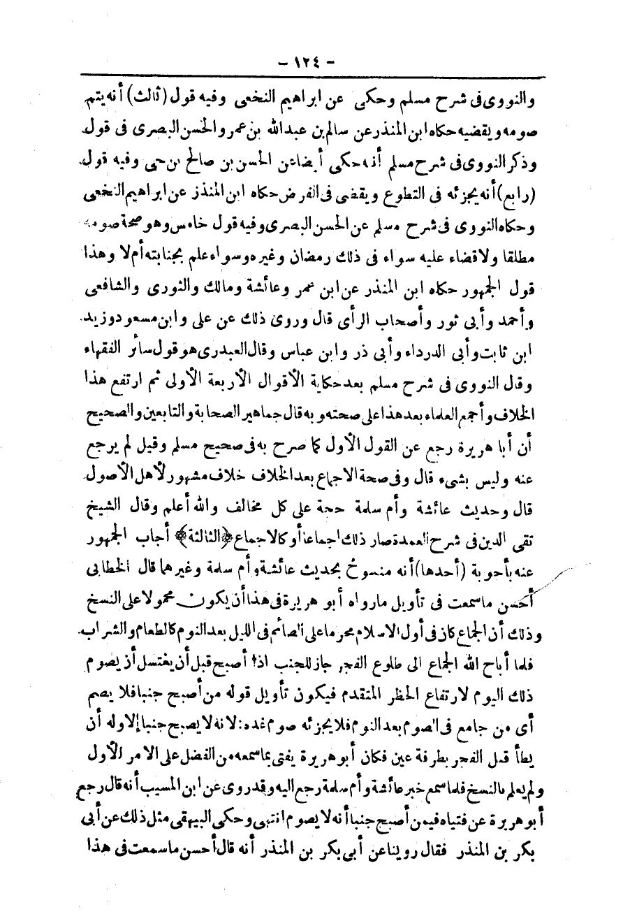 ـــــــــــــــــــــــــــــQوَالنَّوَوِيُّ فِي شَرْحِ مُسْلِمٍ وَحُكِيَ عَنْ إبْرَاهِيمَ النَّخَعِيّ وَفِيهِ قَوْلٌ (ثَالِثٌ) أَنَّهُ يُتِمُّ صَوْمَهُ وَيَقْضِيهِ حَكَاهُ ابْنُ الْمُنْذِرِ عَنْ سَالِمِ بْنِ عَبْدِ اللَّهِ بْنِ عُمَرَ وَالْحَسَنِ الْبَصْرِيِّ فِي قَوْلٍ، وَذَكَرَ النَّوَوِيُّ فِي شَرْحِ مُسْلِمٍ أَنَّهُ حُكِيَ أَيْضًا عَنْ الْحَسَنِ بْنِ صَالِحِ بْنِ حَيٍّ وَفِيهِ قَوْلٌ (رَابِعٌ) أَنَّهُ يُجْزِئُهُ فِي التَّطَوُّعِ وَيَقْضِي فِي الْفَرْضِ حَكَاهُ ابْنُ الْمُنْذِرِ عَنْ إبْرَاهِيمَ النَّخَعِيّ وَحَكَاهُ النَّوَوِيُّ فِي شَرْحِ مُسْلِمٍ عَنْ الْحَسَنِ الْبَصْرِيِّ وَفِيهِ قَوْلٌ (خَامِسٌ) وَهُوَ صِحَّةُ صَوْمِهِ مُطْلَقًا وَلَا قَضَاءَ عَلَيْهِ سَوَاءٌ فِي ذَلِكَ رَمَضَانُ وَغَيْرُهُ وَسَوَاءٌ عَلِمَ بِجَنَابَتِهِ أَمْ لَا وَهَذَا قَوْلُ الْجُمْهُورِ حَكَاهُ ابْنُ الْمُنْذِرِ عَنْ ابْنِ عُمَرَ وَعَائِشَةَ وَمَالِكٍ وَالثَّوْرِيِّ وَالشَّافِعِيِّ وَأَحْمَدَ وَأَبِي ثَوْرٍ وَأَصْحَابِ الرَّأْيِ قَالَ، وَرُوِيَ ذَلِكَ عَنْ عَلِيٍّ وَابْنِ مَسْعُودٍ وَزَيْدِ بْنِ ثَابِتٍ وَأَبِي الدَّرْدَاءِ وَأَبِي ذَرٍّ وَابْنِ عَبَّاسٍ.