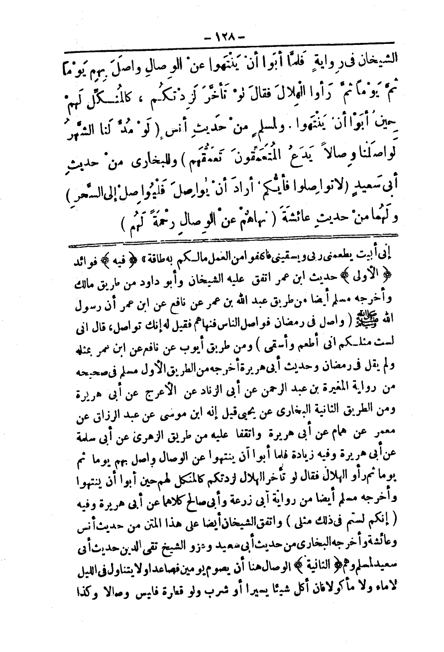 (الْأُولَى) حَدِيثُ ابْنِ عُمَرَ اتَّفَقَ عَلَيْهِ الشَّيْخَانِ وَأَبُو دَاوُد مِنْ طَرِيقِ مَالِكٍ وَأَخْرَجَهُ مُسْلِمٌ أَيْضًا مِنْ طَرِيقِ عَبْدِ اللَّهِ بْنِ عُمَرَ عَنْ نَافِعٍ عَنْ ابْنِ عُمَرَ «أَنَّ رَسُولَ اللَّهِ - صَلَّى اللَّهُ عَلَيْهِ وَسَلَّمَ - وَاصَلَ فِي رَمَضَانَ فَوَاصَلَ النَّاسُ فَنَهَاهُمْ فَقِيلَ لَهُ إنَّك تُوَاصِلُ، قَالَ إنِّي لَسْت مِثْلَكُمْ إنِّي أُطْعَمُ وَأُسْقَى» وَمِنْ طَرِيقِ أَيُّوبَ عَنْ نَافِعٍ عَنْ ابْنِ عُمَرَ بِمِثْلِهِ وَلَمْ يَقُلْ فِي رَمَضَانَ