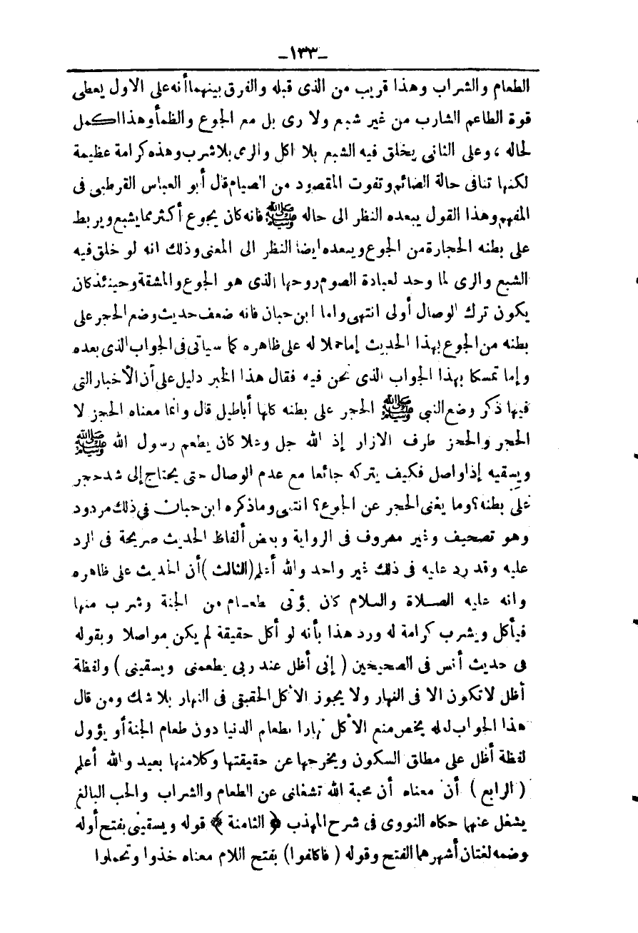 (الثَّالِثُ) أَنَّ الْحَدِيثَ عَلَى ظَاهِرِهِ وَأَنَّهُ - عَلَيْهِ الصَّلَاةُ وَالسَّلَامُ - كَانَ يُؤْتَى الطَّعَامَ مِنْ الْجَنَّةِ وَشَرِبَ مِنْهَا فَيَأْكُلُ وَيَشْرَبُ كَرَامَةً لَهُ وَرُدَّ هَذَا بِأَنَّهُ لَوْ أَكَلَ حَقِيقَةً لَمْ يَكُنْ مُوَاصِلًا وَبِقَوْلِهِ فِي حَدِيثِ أَنَسٍ فِي الصَّحِيحَيْنِ «إنِّي أَظَلُّ عِنْدَ رَبِّي يُطْعِمُنِي وَيَسْقِينِي» وَلَفْظَةُ أَظَلُّ لَا تَكُونُ إلَّا فِي النَّهَارِ وَلَا يَجُوزُ الْأَكْلُ الْحَقِيقِيُّ فِي النَّهَارِ بِلَا شَكٍّ وَمَنْ قَالَ هَذَا الْجَوَابُ لَعَلَّهُ يَخُصُّ مَنْعَ الْأَكْلِ نَهَارًا بِطَعَامِ الدُّنْيَا دُونَ طَعَامِ الْجَنَّةِ أَوْ يُؤَوِّلُ لَفْظَةَ أَظَلُّ عَلَى مُطْلَقِ السُّكُونِ وَيَخْرُجهَا عَنْ حَقِيقَتِهَا وَكُلًّا مِنْهَا بَعِيدٌ وَاَللَّهُ أَعْلَمُ.