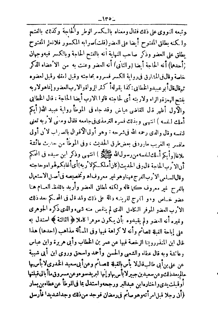ـــــــــــــــــــــــــــــQوَتَبِعَهُ النَّوَوِيُّ عَلَى ذَلِكَ فَقَالَ وَمَعْنَاهُ بِالْكَسْرِ الْوَطَرُ وَالْحَاجَةُ وَكَذَلِكَ بِالْفَتْحِ وَلَكِنَّهُ يُطْلَقُ الْمَفْتُوحُ أَيْضًا عَلَى الْعُضْوِ (قُلْت) صَوَابُهُ الْمَكْسُورُ فَلَا نَعْلَمُ الْمَفْتُوحَ يُطْلَقُ عَلَى الْعُضْوِ، وَذَكَرَ صَاحِبُ النِّهَايَةِ أَنَّهُ بِالْفَتْحِ الْحَاجَةُ وَبِالْكَسْرِ فِيهِ وَجْهَانِ: