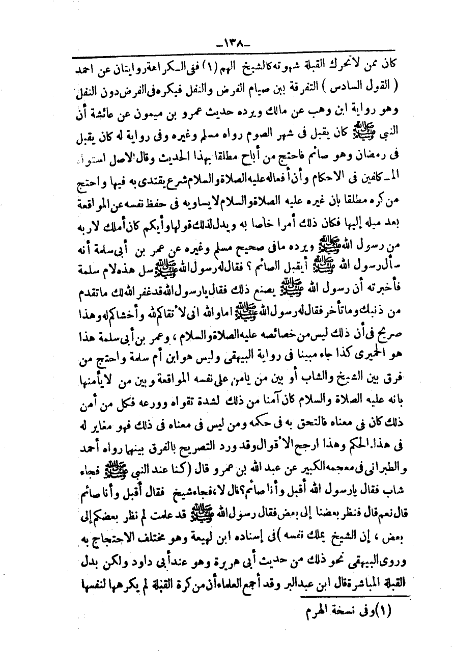 (الْقَوْلُ السَّادِسُ) التَّفْرِقَةُ بَيْنَ صِيَامِ الْفَرْضِ وَالنَّفَلِ فَيُكْرَهُ فِي الْفَرْضِ دُونَ النَّفْلِ وَهُوَ رِوَايَةُ ابْنِ وَهْبٍ عَنْ مَالِكٍ وَيَرُدُّهُ حَدِيثُ عَمْرِو بْنِ مَيْمُونٍ عَنْ عَائِشَةَ أَنَّ النَّبِيَّ - صَلَّى اللَّهُ عَلَيْهِ وَسَلَّمَ - «كَانَ يُقَبِّلُ فِي شَهْرِ الصَّوْمِ» رَوَاهُ مُسْلِمٌ وَغَيْرُهُ وَفِي رِوَايَةٍ لَهُ «كَانَ يُقَبِّلُ فِي رَمَضَانَ وَهُوَ صَائِمٌ» فَاحْتَجَّ مَنْ أَبَاحَ مُطْلَقًا بِهَذَا الْحَدِيثِ، وَقَالَ الْأَصْلُ اسْتِوَاءُ الْمُكَلَّفِينَ فِي الْأَحْكَامِ وَأَنَّ أَفْعَالَهُ - عَلَيْهِ الصَّلَاةُ وَالسَّلَامُ - شَرْعٌ يُقْتَدَى بِهِ فِيهَا وَاحْتَجَّ مَنْ كَرِهَ مُطْلَقًا بِأَنَّ غَيْرَهُ - عَلَيْهِ الصَّلَاةُ وَالسَّلَامُ - لَا يُسَاوِيهِ فِي حِفْظِ نَفْسِهِ عَنْ الْمُوَاقَعَةِ بَعْدَ مَيْلِهِ إلَيْهَا فَكَانَ ذَلِكَ أَمْرًا خَاصًّا بِهِ، وَيَدُلُّ لِذَلِكَ قَوْلُهَا وَأَيُّكُمْ كَانَ أَمْلَكَ لِإِرْبِهِ مِنْ رَسُولِ اللَّهِ - صَلَّى اللَّهُ عَلَيْهِ وَسَلَّمَ - وَيَرُدُّهُ مَا فِي صَحِيحِ مُسْلِمٍ وَغَيْرِهِ عَنْ عُمَرَ بْنِ أَبِي سَلَمَةَ أَنَّهُ «سَأَلَ رَسُولَ اللَّهِ - صَلَّى اللَّهُ عَلَيْهِ وَسَلَّمَ - أَيُقَبِّلُ الصَّائِمُ؟ فَقَالَ لَهُ رَسُولُ اللَّهِ - صَلَّى اللَّهُ عَلَيْهِ وَسَلَّمَ - سَلْ هَذِهِ لِأُمِّ سَلَمَةَ فَأَخْبَرَتْهُ أَنَّ رَسُولَ اللَّهِ - صَلَّى اللَّهُ عَلَيْهِ وَسَلَّمَ - يَصْنَعُ ذَلِكَ فَقَالَ يَا رَسُولَ اللَّهِ قَدْ غَفَرَ اللَّهُ لَك مَا تَقَدَّمَ مِنْ ذَنْبِكَ وَمَا تَأَخَّرَ فَقَالَ لَهُ رَسُولُ اللَّهِ - صَلَّى اللَّهُ عَلَيْهِ وَسَلَّمَ - أَمَا وَاَللَّهِ إنِّي لِأَتْقَاكُمْ لِلَّهِ وَأَخْشَاكُمْ لَهُ» وَهَذَا صَرِيحٌ فِي أَنَّ ذَلِكَ لَيْسَ مِنْ خَصَائِصِهِ - عَلَيْهِ الصَّلَاةُ وَالسَّلَامُ -، وَعُمَرُ بْنُ أَبِي سَلَمَةَ هَذَا هُوَ الْحِمْيَرِيُّ. كَذَا جَاءَ مُبَيَّنًا فِي رِوَايَةِ الْبَيْهَقِيّ وَلَيْسَ هُوَ ابْنُ أُمِّ سَلِمَةَ وَاحْتَجَّ مَنْ فَرَّقَ بَيْنَ الشَّيْخِ وَالشَّابِّ أَوْ بَيْنَ مَنْ يَأْمَنُ عَلَى نَفْسِهِ الْمُوَاقَعَةَ وَبَيْنَ مَنْ لَا يَأْمَنُهَا بِأَنَّهُ - عَلَيْهِ الصَّلَاةُ وَالسَّلَامُ - كَانَ آمِنًا مِنْ ذَلِكَ لِشِدَّةِ تَقْوَاهُ وَوَرَعِهِ فَكُلُّ مَنْ أَمِنَ ذَلِكَ كَانَ فِي مَعْنَاهُ فَالْتَحَقَ بِهِ فِي حُكْمِهِ وَمَنْ لَيْسَ فِي مَعْنَاهُ فِي ذَلِكَ فَهُوَ مُغَايِرٌ لَهُ فِي هَذَا الْحُكْمِ وَهَذَا أَرْجَحُ الْأَقْوَالِ، وَقَدْ وَرَدَ التَّصْرِيحُ بِالْفَرْقِ بَيْنَهُمَا رَوَاهُ أَحْمَدُ وَالطَّبَرَانِيُّ فِي مُعْجَمِهِ الْكَبِيرِ عَنْ عَبْدِ اللَّهِ بْنِ عَمْرٍو قَالَ «كُنَّا عِنْدَ النَّبِيِّ - صَلَّى اللَّهُ عَلَيْهِ وَسَلَّمَ - فَجَاءَ شَابٌّ فَقَالَ يَا رَسُولَ اللَّهِ أُقَبِّلُ وَأَنَا صَائِمٌ؟ قَالَ لَا، فَجَاءَ شَيْخٌ فَقَالَ أُقَبِّلُ وَأَنَا صَائِمٌ قَالَ نَعَمْ. قَالَ فَنَظَرَ بَعْضُنَا إلَى بَعْضٍ فَقَالَ رَسُولُ اللَّهِ - صَلَّى اللَّهُ عَلَيْهِ وَسَلَّمَ - قَدْ عَلِمْتُ لِمَ نَظَرَ بَعْضُكُمْ إلَى بَعْضٍ، إنَّ الشَّيْخَ يَمْلِكُ نَفْسَهُ» فِي إسْنَادِهِ ابْنُ لَهِيعَةَ وَهُوَ مُخْتَلَفُ الِاحْتِجَاجِ بِهِ، وَرَوَى الْبَيْهَقِيُّ نَحْوَ ذَلِكَ مِنْ حَدِيثِ أَبِي هُرَيْرَةَ وَهُوَ عِنْدَ أَبِي دَاوُد وَلَكِنْ بَدَلُ الْقُبْلَةِ الْمُبَاشَرَةُ قَالَ ابْنُ عَبْدِ الْبَرِّ، وَقَدْ أَجْمَعَ الْعُلَمَاءُ أَنَّ مَنْ كَرِهَ الْقُبْلَةَ لَمْ يَكْرَهَا لِنَفْسِهَا