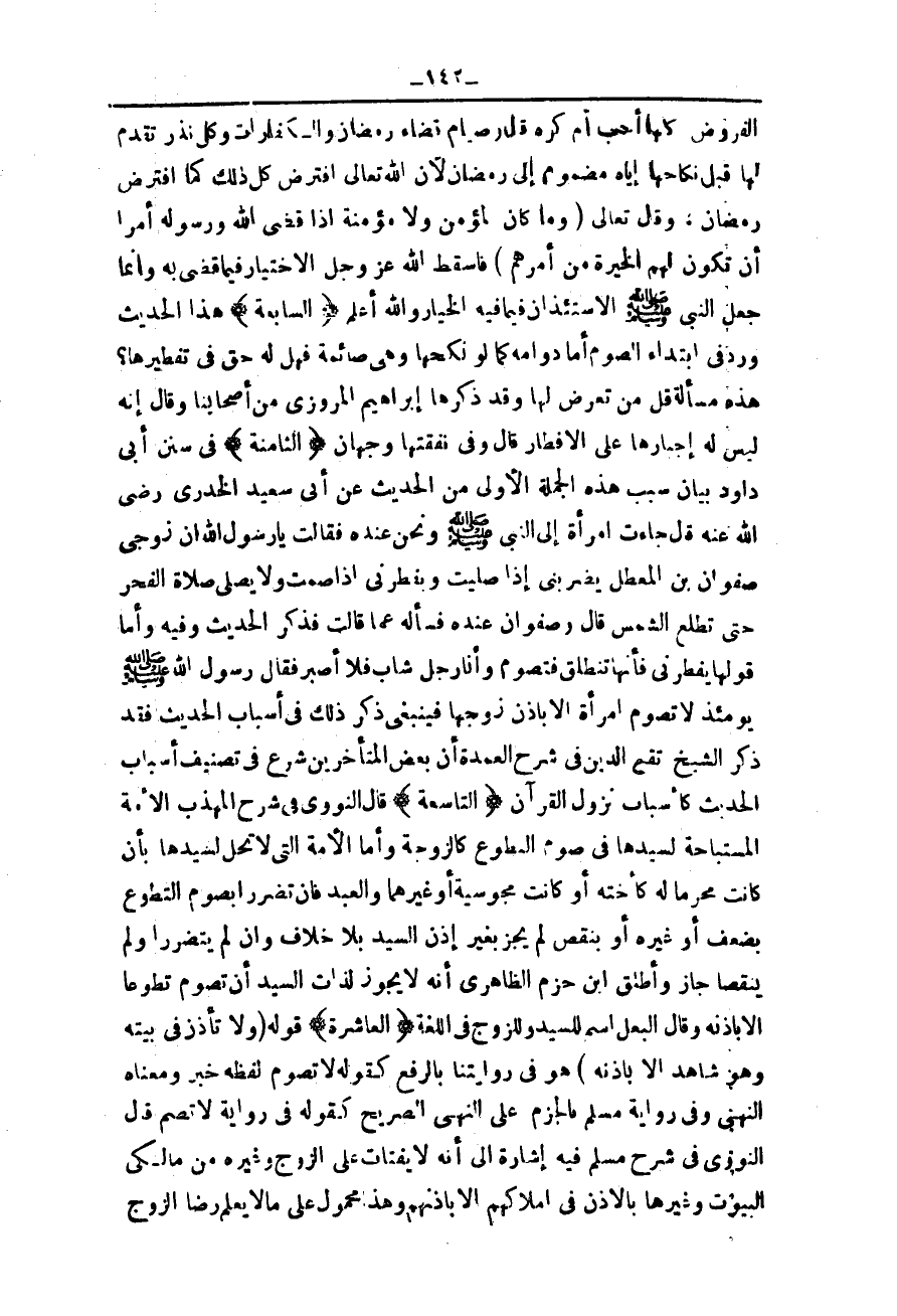 (الْعَاشِرَةُ) قَوْلُهُ «وَلَا تَأْذَنُ فِي بَيْتِهِ وَهُوَ شَاهِدٌ إلَّا بِإِذْنِهِ» هُوَ فِي رِوَايَتِنَا بِالرَّفْعِ كَقَوْلِهِ «لَا تَصُومُ» لَفْظُهُ خَبَرٌ وَمَعْنَاهُ النَّهْيُ وَفِي رِوَايَةِ مُسْلِمٍ بِالْجَزْمِ عَلَى النَّهْيِ الصَّرِيحِ كَقَوْلِهِ فِي رِوَايَةِ «لَا تَصُمْ» قَالَ النَّوَوِيُّ فِي شَرْحِ مُسْلِمٍ فِيهِ إشَارَةٌ إلَى أَنَّهُ لَا يُفْتَاتُ عَلَى الزَّوْجِ وَغَيْرِهِ مِنْ مَالِكِي الْبُيُوتِ وَغَيْرِهَا بِالْإِذْنِ فِي أَمْلَاكِهِمْ إلَّا بِإِذْنِهِمْ وَهَذَا مَحْمُولٌ عَلَى مَا لَا يُعْلَمُ رِضَا الزَّوْجِ