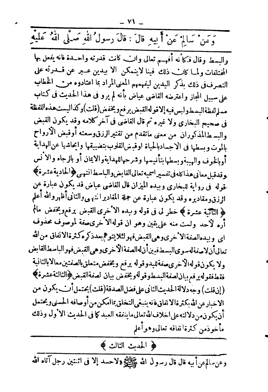 {الثَّانِيَةَ عَشْرَةَ} خَطَرَ لِي فِي قَوْلِهِ " وَبِيَدِهِ الْأُخْرَى الْقَبْضُ يَرْفَعُ وَيَخْفِضُ " مَا لَمْ أَرَهُ لِأَحَدٍ وَلَسْت مِنْهُ عَلَى يَقِينٍ وَهُوَ أَنَّ قَوْلَهُ الْأُخْرَى صِفَةٌ لِمَوْصُوفٍ مَحْذُوفٍ أَيْ وَبِيَدِهِ الصِّفَةُ الْأُخْرَى وَهِيَ الْقَبْضُ، فَهُوَ لِئَلَّا يُتَوَهَّمَ بَعْدَ ذِكْرِهِ كَثْرَةَ الْإِنْفَاقِ مِنْ اللَّهِ تَعَالَى أَنْ لَا صِفَةَ لَهُ سِوَى الْبَسْطِ فَبَيَّنَ أَنَّ لَهُ الصِّفَةَ الْأُخْرَى وَهِيَ الْقَبْضُ فَهُوَ الْبَاسِطُ الْقَابِضُ وَلَا يَكُونُ قَوْلُهُ الْأُخْرَى صِفَةً لِلْيَدِ، وَقَوْلُهُ يَرْفَعُ وَيَخْفِضُ مُتَعَلِّقٌ بِالصِّفَتَيْنِ مَعًا لَا بِالثَّانِيَةِ فَقَطْ، فَقَوْلُهُ يَرْفَعُ بَيَانٌ لِصِفَةِ الْبَسْطِ، وَقَوْلُهُ وَيَخْفِضُ بَيَانٌ لِصِفَةِ الْقَبْضِ.