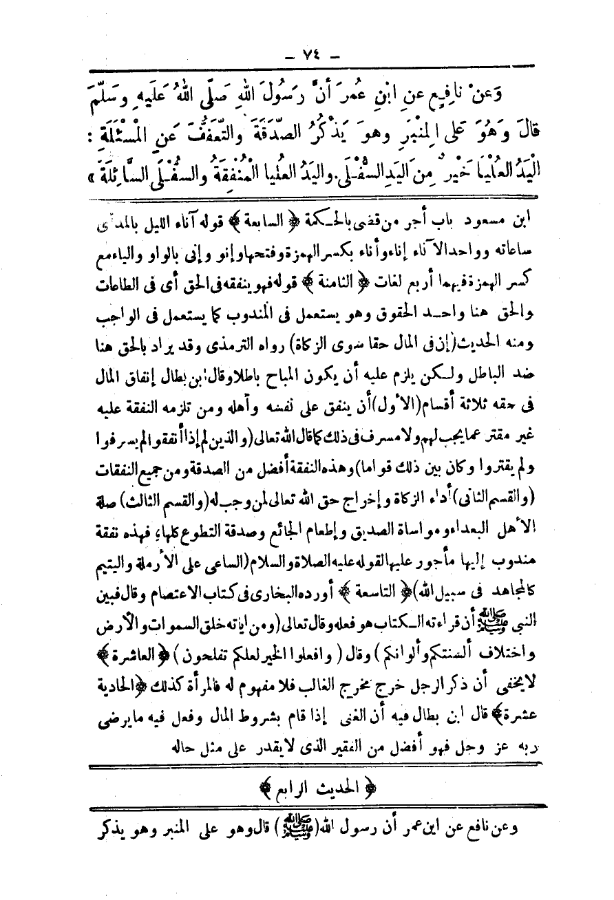 وَعَنْ نَافِعٍ عَنْ ابْنِ عُمَرَ أَنَّ رَسُولَ اللَّهِ - صَلَّى اللَّهُ عَلَيْهِ وَسَلَّمَ - «قَالَ وَهُوَ عَلَى الْمِنْبَرِ وَهُوَ يَذْكُرُ الصَّدَقَةَ وَالتَّعَفُّفَ عَنْ الْمَسْأَلَةِ: الْيَدُ الْعُلْيَا خَيْرٌ مِنْ الْيَدِ السُّفْلَى، وَالْيَدُ الْعُلْيَا الْمُنْفِقَةُ وَالسُّفْلَى السَّائِلَةُ» ..