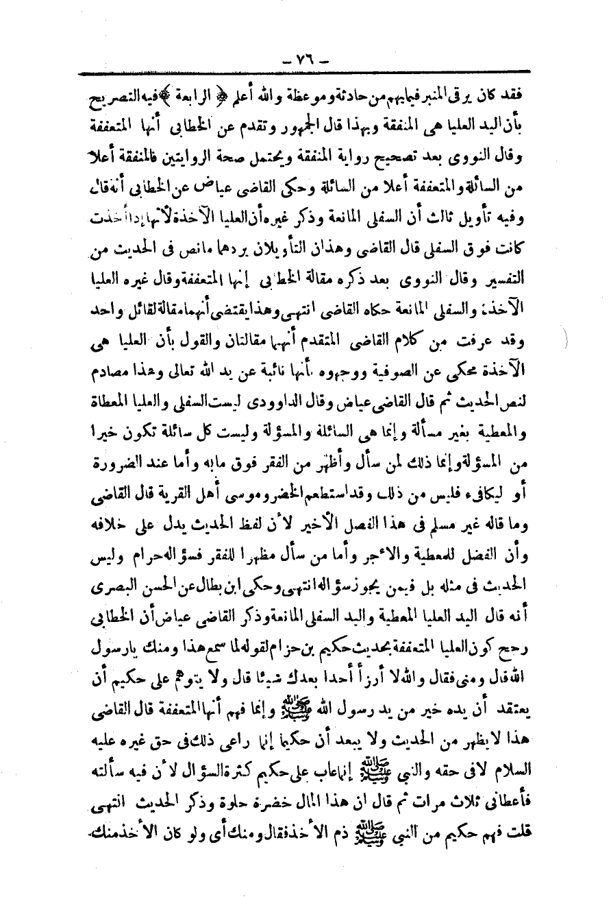 وَقَالَ النَّوَوِيُّ بَعْدَ ذِكْرِهِ مَقَالَةَ الْخَطَّابِيِّ إنَّهَا الْمُتَعَفِّفَةُ، وَقَالَ غَيْرُهُ الْعُلْيَا الْآخِذَةُ وَالسُّفْلَى الْمَانِعَةُ حَكَاهُ الْقَاضِي انْتَهَى وَهَذَا يَقْتَضِي أَنَّهُمَا مَقَالَةٌ لِقَائِلٍ وَاحِدٍ، وَقَدْ عَرَفْت مِنْ كَلَامِ الْقَاضِي الْمُتَقَدِّمِ أَنَّهُمَا مَقَالَتَانِ وَالْقَوْلُ بِأَنَّ الْعُلْيَا هِيَ الْآخِذَةُ مَحْكِيٌّ عَنْ الصُّوفِيَّةِ وَوَجَّهُوهُ بِأَنَّهَا نَائِبَةٌ عَنْ يَدِ اللَّهِ تَعَالَى وَهَذَا مُصَادِمٌ لِنَصِّ الْحَدِيثِ ثُمَّ قَالَ الْقَاضِي عِيَاضٌ وَقَالَ الدَّاوُدِيُّ لَيْسَتْ السُّفْلَى وَالْعُلْيَا الْمُعْطَاةُ وَالْمُعْطِيَةُ بِغَيْرِ مَسْأَلَةٍ، وَإِنَّمَا هِيَ السَّائِلَةُ وَالْمَسْئُولَةُ وَلَيْسَتْ كُلُّ سَائِلَةٍ تَكُونُ خَيْرًا مِنْ الْمَسْئُولَةِ، وَإِنَّمَا ذَلِكَ لِمَنْ سَأَلَ وَأَظْهَرَ مِنْ الْفَقْرِ فَوْقَ مَا بِهِ وَأَمَّا عِنْدَ الضَّرُورَةِ أَوْ لِيُكَافِئَ فَلَيْسَ مِنْ ذَلِكَ، وَقَدْ اسْتَطْعَمَ الْخَضِرُ وَمُوسَى أَهْلَ الْقَرْيَةِ. قَالَ الْقَاضِي وَمَا قَالَهُ غَيْرُ مُسْلِمٍ فِي هَذَا الْفَصْلِ الْأَخِيرِ؛ لِأَنَّ لَفْظَ الْحَدِيثِ يَدُلُّ عَلَى خِلَافِهِ وَأَنَّ الْفَضْلَ لِلْمُعْطِيَةِ وَالْأَجْرَ.