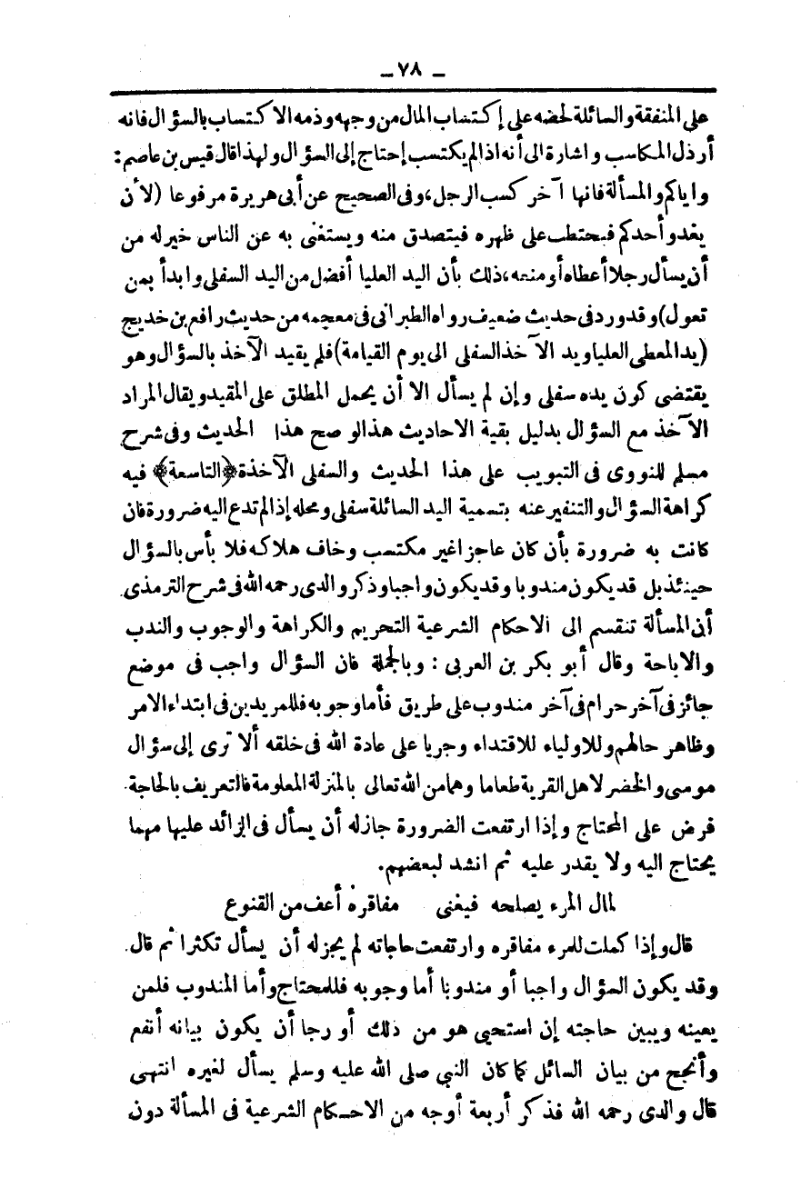 {التَّاسِعَةُ} فِيهِ كَرَاهَةُ السُّؤَالِ وَالتَّنْفِيرَ عَنْهُ بِتَسْمِيَةِ الْيَدِ السَّائِلَةِ سُفْلَى وَمَحَلُّهُ إذَا لَمْ تَدْعُ إلَيْهِ ضَرُورَةٌ فَإِنْ كَانَتْ بِهِ ضَرُورَةٌ بِأَنْ كَانَ عَاجِزًا غَيْرَ مُكْتَسِبٍ وَخَافَ هَلَاكَهُ فَلَا بَأْسَ بِالسُّؤَالِ حِينَئِذٍ بَلْ قَدْ يَكُونُ مَنْدُوبًا، وَقَدْ يَكُونُ وَاجِبًا، وَذَكَرَ وَالِدِي - رَحِمَهُ اللَّهُ - فِي شَرْحِ التِّرْمِذِيِّ أَنَّ الْمَسْأَلَةَ تَنْقَسِمُ إلَى الْأَحْكَامِ الشَّرْعِيَّةِ: التَّحْرِيمُ وَالْكَرَاهَةُ وَالْوُجُوبُ وَالنَّدْبُ وَالْإِبَاحَةُ.