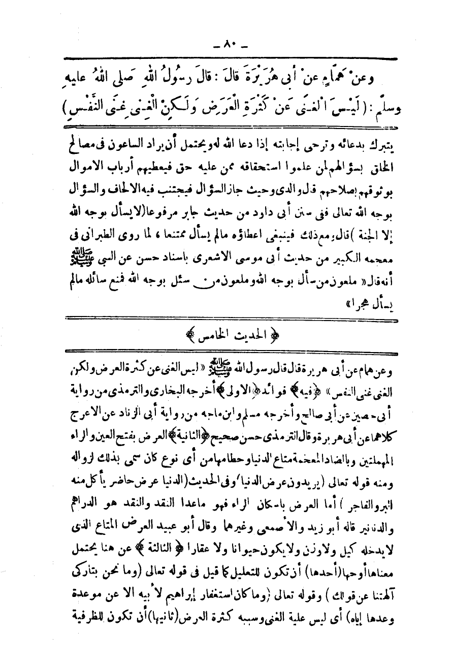 {الْحَدِيثُ الْخَامِسُ} وَعَنْ هَمَّامٍ عَنْ أَبِي هُرَيْرَةَ قَالَ قَالَ رَسُولُ اللَّهِ - صَلَّى اللَّهُ عَلَيْهِ وَسَلَّمَ - «لَيْسَ الْغِنَى عَنْ كَثْرَةِ الْعَرَضِ وَلَكِنَّ الْغِنَى غِنَى النَّفْسِ» . {فِيهِ} فَوَائِدُ: {الْأُولَى} أَخْرَجَهُ الْبُخَارِيُّ وَالتِّرْمِذِيُّ مِنْ رِوَايَةِ أَبِي حُصَيْنٍ عَنْ أَبِي صَالِحٍ وَأَخْرَجَهُ مُسْلِمٌ وَابْنُ مَاجَهْ مِنْ رِوَايَةِ أَبِي الزِّنَادِ عَنْ الْأَعْرَجِ كِلَاهُمَا عَنْ أَبِي هُرَيْرَةَ، وَقَالَ التِّرْمِذِيُّ حَسَنٌ صَحِيحٌ.