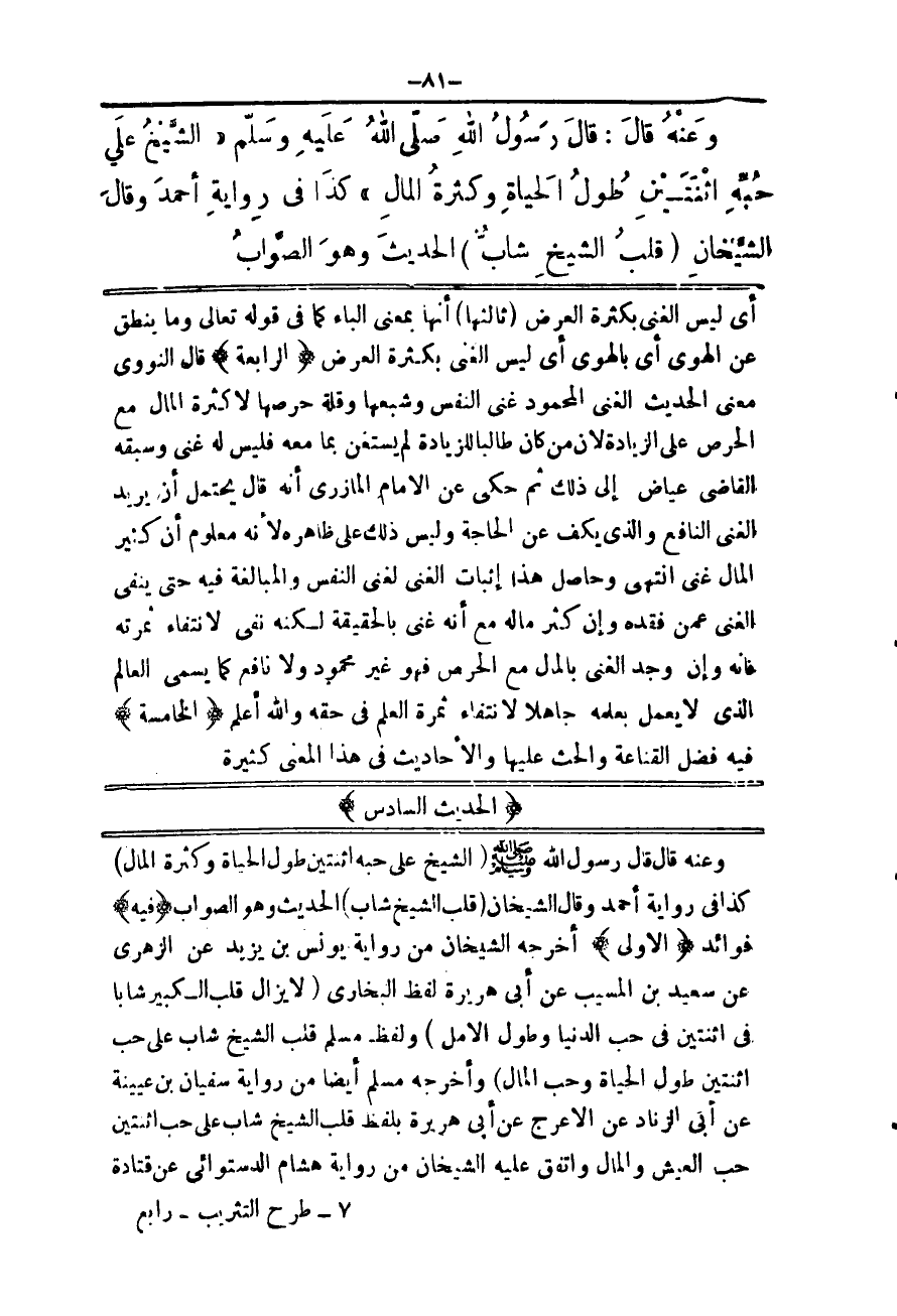 {الْحَدِيثُ السَّادِسُ} وَعَنْهُ قَالَ قَالَ رَسُولُ اللَّهِ - صَلَّى اللَّهُ عَلَيْهِ وَسَلَّمَ - «الشَّيْخُ عَلَى حُبِّهِ اثْنَتَيْنِ طُولُ الْحَيَاةِ وَكَثْرَةُ الْمَالِ» كَذَا فِي رِوَايَةِ أَحْمَدَ.