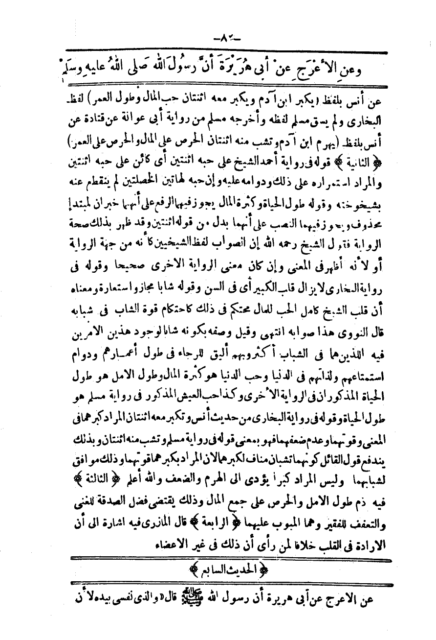 ـــــــــــــــــــــــــــــQعَنْ أَنَسٍ بِلَفْظِ «يَكْبُرُ ابْنُ آدَمَ وَيَكْبُرُ مَعَهُ اثْنَتَانِ حُبُّ الْمَالِ وَطُولُ الْعُمْرِ» لَفْظُ الْبُخَارِيِّ، وَلَمْ يَسُقْ مُسْلِمٌ لَفْظَهُ وَأَخْرَجَهُ مُسْلِمٌ مِنْ رِوَايَةِ أَبِي عَوَانَةَ عَنْ قَتَادَةَ عَنْ أَنَسٍ بِلَفْظِ «يَهْرَمُ ابْنُ آدَمَ وَتَشِبُّ مِنْهُ اثْنَتَانِ الْحِرْصُ عَلَى الْمَالِ وَالْحِرْصُ عَلَى الْعُمْرِ» . {الثَّانِيَةُ} قَوْلُهُ فِي رِوَايَةِ أَحْمَدَ «الشَّيْخُ عَلَى حُبِّهِ اثْنَتَيْنِ» أَيْ كَائِنٌ عَلَى حُبِّهِ اثْنَتَيْنِ وَالْمُرَادُ اسْتِمْرَارُهُ عَلَى ذَلِكَ وَدَوَامُهُ عَلَيْهِ وَأَنَّ حُبَّهُ لِهَاتَيْنِ الْخَصْلَتَيْنِ لَمْ يَنْقَطِعْ عَنْهُ بِشَيْخُوخَتِهِ، وَقَوْلُهُ «طُولُ الْحَيَاةِ» وَكَثْرَةُ الْمَالِ يَجُوزُ فِيهِمَا الرَّفْعُ عَلَى أَنَّهُمَا خَبَرَانِ لِمُبْتَدَأٍ مَحْذُوفٍ وَيَجُوزُ فِيهِمَا النَّصْبُ عَلَى أَنَّهُمَا بَدَلٌ مِنْ قَوْلِهِ «اثْنَتَيْنِ» ، وَقَدْ ظَهَرَ بِذَلِكَ صِحَّةُ الرِّوَايَةِ فَقَوْلُ الشَّيْخِ - رَحِمَهُ اللَّهُ - إنَّ الصَّوَابَ لَفْظُ الشَّيْخَيْنِ كَأَنَّهُ مِنْ جِهَةِ الرِّوَايَةِ أَوْ لِأَنَّهُ أَظْهَرُ فِي الْمَعْنَى وَإِنْ كَانَ مَعْنَى الرِّوَايَةِ الْأُخْرَى صَحِيحًا، وَقَوْلُهُ فِي رِوَايَةِ الْبُخَارِيِّ «لَا يَزَالُ قَلْبُ الْكَبِيرِ» أَيْ فِي السِّنِّ، وَقَوْلُهُ «شَابًّا»