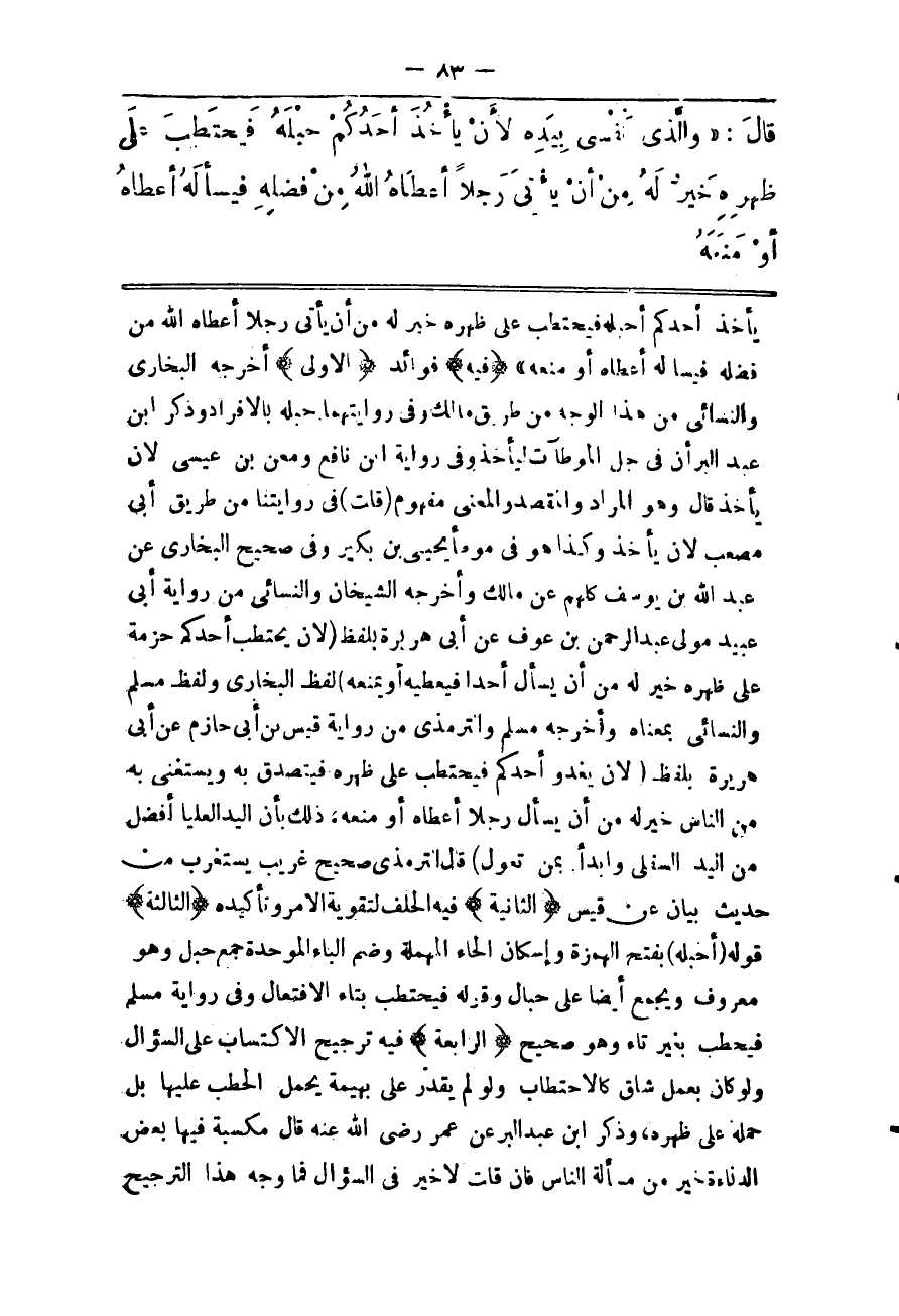 قَالَ: «وَاَلَّذِي نَفْسِي بِيَدِهِ لَأَنْ يَأْخُذَ أَحَدُكُمْ حَبْلَهُ فَيَحْتَطِبَ عَلَى ظَهْرِهِ خَيْرٌ لَهُ مِنْ أَنْ يَأْتِيَ رَجُلًا أَعْطَاهُ اللَّهُ مِنْ فَضْلِهِ فَيَسْأَلَهُ أَعْطَاهُ أَوْ مَنَعَهُ» ..