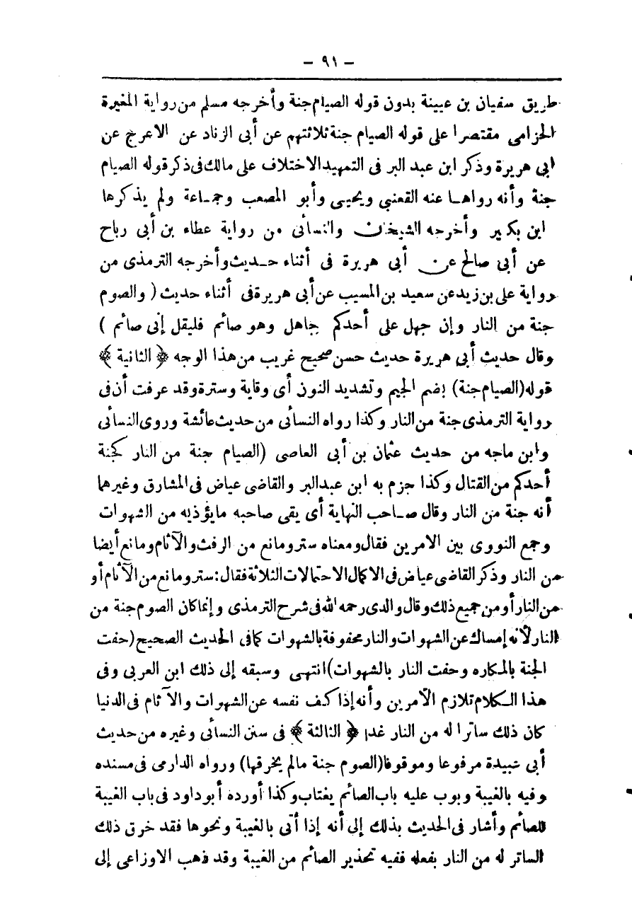 ـــــــــــــــــــــــــــــQطَرِيقِ سُفْيَانَ بْنِ عُيَيْنَةَ بِدُونِ قَوْلِهِ «الصِّيَامُ جُنَّةٌ» وَأَخْرَجَهُ مُسْلِمٌ مِنْ رِوَايَةِ الْمُغِيرَةِ الْحِزَامِيِّ مُقْتَصِرًا عَلَى قَوْلِهِ «الصِّيَامُ جُنَّةٌ» ثَلَاثَتُهُمْ عَنْ أَبِي الزِّنَادِ عَنْ الْأَعْرَجِ عَنْ أَبِي هُرَيْرَةَ، وَذَكَرَ ابْنُ عَبْدِ الْبَرِّ فِي التَّمْهِيدِ الِاخْتِلَافَ عَلَى مَالِكٍ فِي ذِكْرِ قَوْلِهِ «الصِّيَامُ جُنَّةٌ» وَأَنَّهُ رَوَاهَا عَنْهُ الْقَعْنَبِيُّ وَيَحْيَى وَأَبُو الْمُصْعَبِ وَجَمَاعَةٌ وَلَمْ يَذْكُرْهَا ابْنُ بُكَيْر وَأَخْرَجَهُ الشَّيْخَانِ وَالنَّسَائِيُّ مِنْ رِوَايَةِ عَطَاءِ بْنِ أَبِي رَبَاحٍ عَنْ أَبِي صَالِحٍ عَنْ أَبِي هُرَيْرَةَ فِي أَثْنَاءِ حَدِيثٍ وَأَخْرَجَهُ التِّرْمِذِيُّ مِنْ رِوَايَةِ عَلِيِّ بْنِ زَيْدٍ عَنْ سَعِيدِ بْنِ الْمُسَيِّبِ عَنْ أَبِي هُرَيْرَةَ فِي أَثْنَاءِ حَدِيثِ «وَالصَّوْمُ جُنَّةٌ مِنْ النَّارِ وَإِنْ جَهِلَ عَلَى أَحَدِكُمْ جَاهِلٌ وَهُوَ صَائِمٌ فَلْيَقُلْ إنِّي صَائِمٌ» وَقَالَ: حَدِيثُ أَبِي هُرَيْرَةَ حَدِيثٌ حَسَنٌ صَحِيحٌ غَرِيبٌ مِنْ هَذَا الْوَجْهِ. {الثَّانِيَةُ} قَوْلُهُ «الصِّيَامُ جُنَّةٌ» بِضَمِّ الْجِيمِ وَتَشْدِيدِ النُّونِ أَيْ وِقَايَةٌ وَسُتْرَةٌ، وَقَدْ عَرَفْتَ أَنَّ فِي رِوَايَةِ التِّرْمِذِيِّ جُنَّةٌ مِنْ النَّارِ، وَكَذَا رَوَاهُ النَّسَائِيّ مِنْ حَدِيثِ عَائِشَةَ، وَرَوَى النَّسَائِيّ وَابْنُ مَاجَهْ مِنْ حَدِيثِ عُثْمَانَ بْنِ أَبِي الْعَاصِي «الصِّيَامُ جُنَّةٌ مِنْ النَّارِ كَجُنَّةِ أَحَدِكُمْ مِنْ الْقِتَالِ»