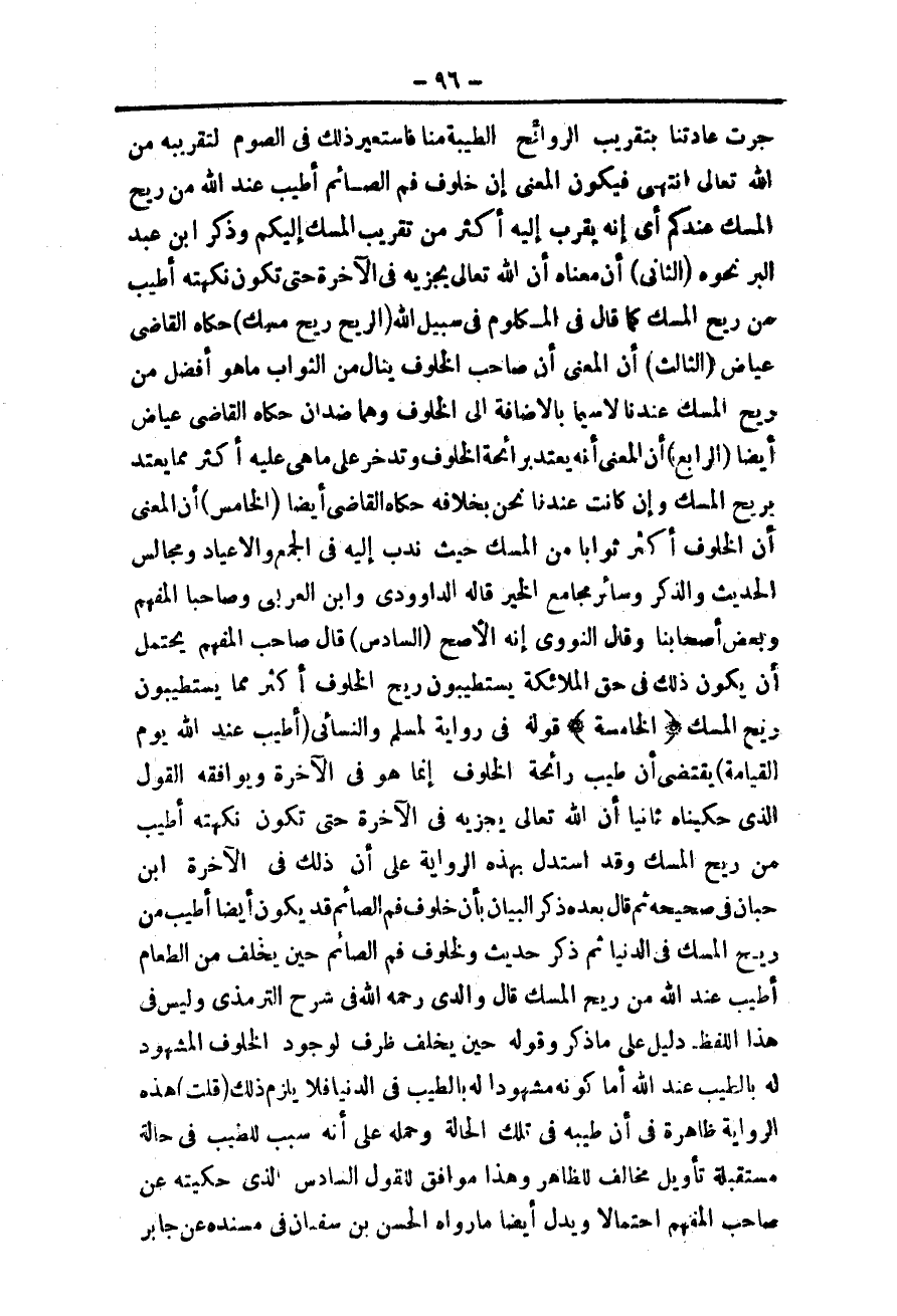 (الرَّابِعُ) أَنَّ الْمَعْنَى أَنَّهُ يُعْتَدُّ بِرَائِحَةِ الْخُلُوفِ وَتُدَّخَرُ عَلَى مَا هِيَ عَلَيْهِ أَكْثَرَ مِمَّا يُعْتَدُّ بِرِيحِ الْمِسْكِ وَإِنْ كَانَتْ عِنْدَنَا نَحْنُ بِخِلَافِهِ حَكَاهُ الْقَاضِي أَيْضًا.