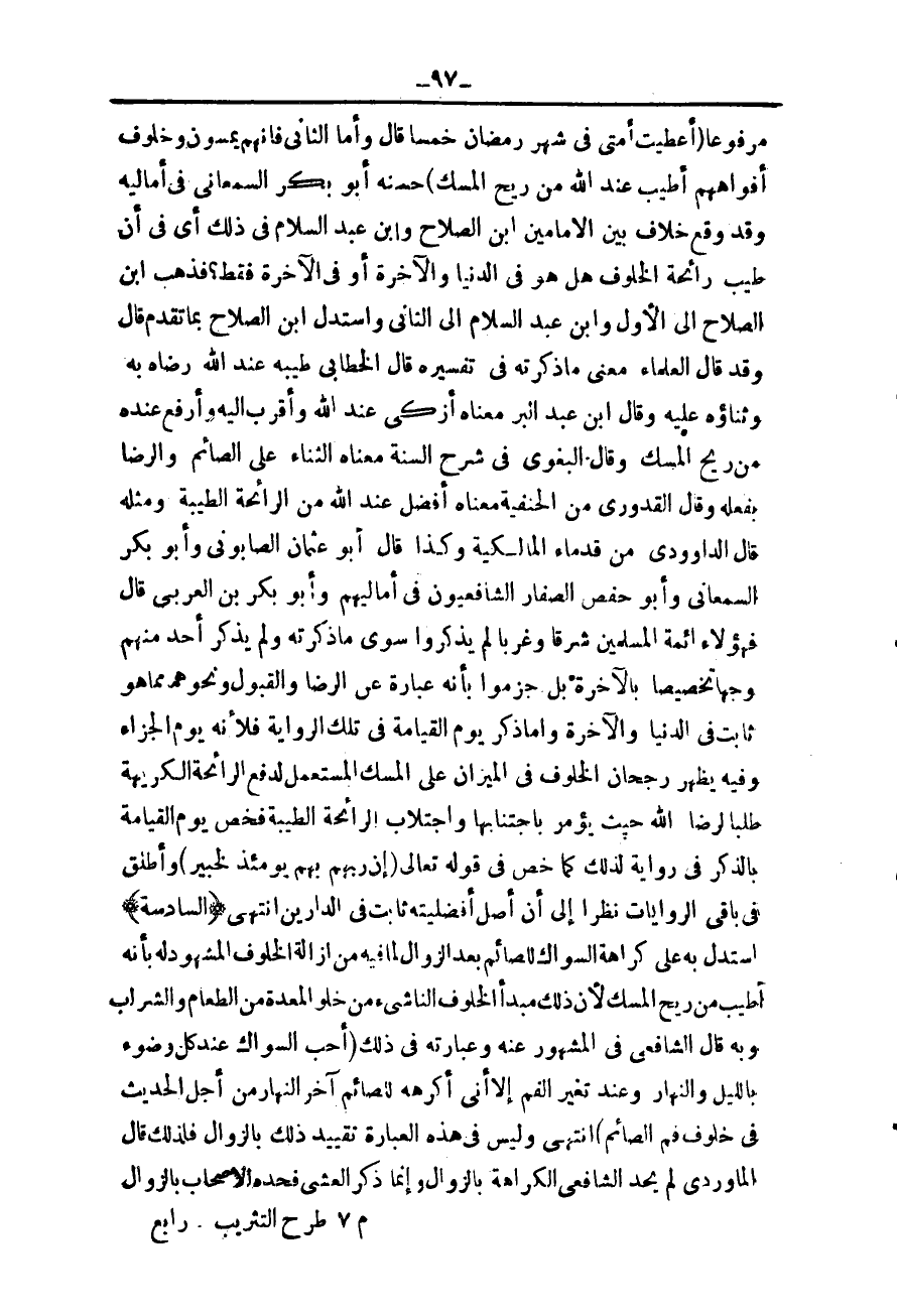ـــــــــــــــــــــــــــــQمَرْفُوعًا «أُعْطِيت أُمَّتِي فِي شَهْرِ رَمَضَانَ خَمْسًا قَالَ وَأَمَّا الثَّانِي فَإِنَّهُمْ يُمْسُونَ وَخُلُوفُ أَفْوَاهِهِمْ أَطْيَبُ عِنْدَ اللَّهِ مِنْ رِيحِ الْمِسْكِ» حَسَّنَهُ أَبُو بَكْرٍ السَّمْعَانِيُّ فِي أَمَالِيهِ، وَقَدْ وَقَعَ خِلَافٌ بَيْنَ الْإِمَامَيْنِ ابْنُ الصَّلَاحِ وَابْنُ عَبْدِ السَّلَامِ فِي ذَلِكَ أَيْ فِي أَنَّ طِيبَ رَائِحَةِ الْخُلُوفِ هَلْ هُوَ فِي الدُّنْيَا وَالْآخِرَةِ أَوْ فِي الْآخِرَةِ فَقَطْ؟ فَذَهَبَ ابْنُ الصَّلَاحِ إلَى الْأَوَّلِ وَابْنُ عَبْدِ السَّلَامِ إلَى الثَّانِي وَاسْتَدَلَّ ابْنُ الصَّلَاحِ بِمَا تَقَدَّمَ قَالَ: وَقَدْ قَالَ الْعُلَمَاءُ مَعْنَى مَا ذَكَرْته فِي تَفْسِيرِهِ قَالَ الْخَطَّابِيُّ طِيبُهُ عِنْدَ اللَّهِ رِضَاهُ بِهِ وَثَنَاؤُهُ عَلَيْهِ، وَقَالَ ابْنُ عَبْدِ الْبَرِّ مَعْنَاهُ أَزْكَى عِنْدَ اللَّهِ وَأَقْرَبُ إلَيْهِ وَأَرْفَعُ عِنْدَهُ مِنْ رِيحِ الْمِسْكِ، وَقَالَ الْبَغَوِيّ فِي شَرْحِ السُّنَّةِ مَعْنَاهُ الثَّنَاءُ عَلَى الصَّائِمِ وَالرِّضَا بِفِعْلِهِ، وَقَالَ الْقُدُورِيُّ مِنْ الْحَنَفِيَّةِ مَعْنَاهُ أَفْضَلُ عِنْدَ اللَّهِ مِنْ الرَّائِحَةِ الطَّيِّبَةِ وَمِثْلُهُ قَالَ الدَّاوُدِيُّ مِنْ قُدَمَاءِ الْمَالِكِيَّةِ، وَكَذَا قَالَ أَبُو عُثْمَانَ الصَّابُونِيُّ وَأَبُو بَكْرٍ السَّمْعَانِيُّ وَأَبُو حَفْصٍ الصَّفَّارُ الشَّافِعِيُّونَ فِي أَمَالِيهِمْ وَأَبُو بَكْرِ بْنُ الْعَرَبِيِّ قَالَ فَهَؤُلَاءِ أَئِمَّةُ الْمُسْلِمِينَ شَرْقًا وَغَرْبًا لَمْ يَذْكُرُوا سِوَى مَا ذَكَرْته وَلَمْ يَذْكُرْ أَحَدٌ مِنْهُمْ وَجْهًا تَخْصِيصًا بِالْآخِرَةِ بَلْ جَزَمُوا بِأَنَّهُ عِبَارَةٌ عَنْ الرِّضَا وَالْقَبُولِ وَنَحْوِهِمَا مِمَّا هُوَ ثَابِتٌ فِي الدُّنْيَا وَالْآخِرَةِ، وَأَمَّا ذِكْرُ يَوْمِ الْقِيَامَةِ فِي تِلْكَ الرِّوَايَةِ فَلِأَنَّهُ يَوْمُ الْجَزَاءِ، وَفِيهِ يَظْهَرُ رُجْحَانُ الْخُلُوفِ فِي الْمِيزَانِ عَلَى الْمِسْكِ الْمُسْتَعْمَلِ لِدَفْعِ الرَّائِحَةِ الْكَرِيهَةِ طَلَبًا لِرِضَا اللَّهِ حَيْثُ يُؤْمَرُ بِاجْتِنَابِهَا وَاجْتِلَابِ الرَّائِحَةِ الطَّيِّبَةِ فَخَصَّ يَوْمَ الْقِيَامَةِ بِالذِّكْرِ فِي رِوَايَةٍ لِذَلِكَ كَمَا خَصَّ فِي قَوْله تَعَالَى {إِنَّ رَبَّهُمْ بِهِمْ يَوْمَئِذٍ لَخَبِيرٌ} [العاديات: 11] وَأَطْلَقَ فِي بَاقِي الرِّوَايَاتِ نَظَرًا إلَى أَنَّ الْأَصْلَ أَفْضَلِيَّتُهُ ثَابِتٌ فِي الدَّارَيْنِ انْتَهَى.