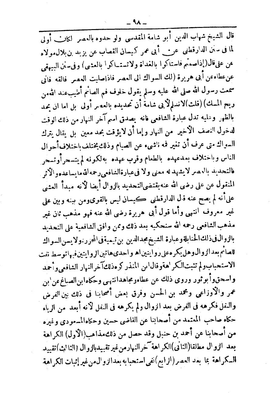 ـــــــــــــــــــــــــــــQقَالَ الشَّيْخُ شِهَابُ الدِّينِ أَبُو شَامَةَ الْمَقْدِسِيَّ وَلَوْ حَدُّوهُ بِالْعَصْرِ لَكَانَ أَوْلَى لِمَا فِي سُنَنِ الدَّارَقُطْنِيِّ عَنْ أَبِي عُمَرَ كَيْسَانَ الْقَصَّابِ عَنْ يَزِيدَ بْنِ بِلَالٍ مَوْلَاهُ عَنْ عَلِيٍّ قَالَ (إذَا صُمْتُمْ فَاسْتَاكُوا بِالْغَدَاةِ وَلَا تَسْتَاكُوا بِالْعَشِيِّ) وَفِي سُنَنِ الْبَيْهَقِيّ عَنْ عَطَاءٍ عَنْ أَبِي هُرَيْرَةَ «لَك السِّوَاكُ إلَى الْعَصْرِ فَإِذَا صَلَّيْت الْعَصْرَ فَأَلْقِهِ فَإِنِّي سَمِعْت رَسُولَ اللَّهِ - صَلَّى اللَّهُ عَلَيْهِ وَسَلَّمَ - يَقُولُ خُلُوفُ فَمِ الصَّائِمِ أَطْيَبُ عِنْدَ اللَّهِ مِنْ رِيحِ الْمِسْكِ» (قُلْت) لَا نُسَلِّمُ لِأَبِي شَامَةَ أَنَّ تَحْدِيدَهُ بِالْعَصْرِ أَوْلَى بَلْ إمَّا أَنْ يَحِدَّ بِالظُّهْرِ وَعَلَيْهِ تَدُلُّ عِبَارَةُ الشَّافِعِيِّ فَإِنَّهُ يَصْدُقُ اسْمُ آخِرِ النَّهَارِ مِنْ ذَلِكَ الْوَقْتِ لِدُخُولِ النِّصْفِ الْأَخِيرِ مِنْ النَّهَارِ، وَإِمَّا أَنْ لَا يُؤَقَّتُ بِحَدٍّ مُعَيَّنٍ بَلْ يُقَالُ يَتْرُكُ السِّوَاكَ مَتَى عَرَفَ أَنَّ تَغَيُّرَ فَمِهِ نَاشِئٌ عَنْ الصِّيَامِ وَذَلِكَ يَخْتَلِفُ بِاخْتِلَافِ أَحْوَالِ النَّاسِ وَبِاخْتِلَافِ بُعْدِ عَهْدِهِ بِالطَّعَامِ وَقُرْبِ عَهْدِهِ بِهِ لِكَوْنِهِ لَمْ يَتَسَحَّرْ أَوْ تَسَحَّرَ فَالتَّحْدِيدُ بِالْعَصْرِ لَا يَشْهَدُ لَهُ مَعْنَى وَلَا فِي عِبَارَةِ الشَّافِعِيِّ - رَحِمَهُ اللَّهُ - مَا يُسَاعِدُهُ وَالْأَثَرُ الْمَنْقُولُ عَنْ عَلِيٍّ - رَضِيَ اللَّهُ عَنْهُ - يَقْتَضِي التَّحْدِيدَ بِالزَّوَالِ أَيْضًا؛ لِأَنَّهُ مَبْدَأُ الْعَشِيِّ عَلَى أَنَّهُ لَمْ يَصِحَّ عَنْهُ. قَالَ الدَّارَقُطْنِيُّ كَيْسَانُ لَيْسَ بِالْقَوِيِّ وَمَنْ بَيْنَهُ وَبَيْنَ عَلِيٍّ غَيْرُ مَعْرُوفٍ انْتَهَى.