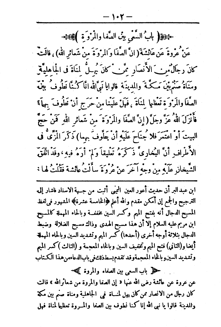 بَابُ السَّعْيِ بَيْنَ الصَّفَا وَالْمَرْوَةِ عَنْ عُرْوَةَ عَنْ عَائِشَةَ « {إِنَّ الصَّفَا وَالْمَرْوَةَ مِنْ شَعَائِرِ اللَّهِ} [البقرة: 158] ، قَالَتْ كَانَ رِجَالٌ مِنْ الْأَنْصَارِ مِمَّنْ كَانَ يُهِلُّ لِمَنَاةَ فِي الْجَاهِلِيَّةِ وَمَنَاةُ صَنَمٌ بَيْنَ مَكَّةَ وَالْمَدِينَةِ قَالُوا يَا نَبِيَّ اللَّهِ إنَّا كُنَّا نَطُوفُ بَيْنَ الصَّفَا وَالْمَرْوَةِ تَعْظِيمًا لِمَنَاةَ، فَهَلْ عَلَيْنَا مِنْ حَرَجٍ أَنْ نَطُوفَ بِهِمَا؟ فَأَنْزَلَ اللَّهُ عَزَّ وَجَلَّ {إِنَّ الصَّفَا وَالْمَرْوَةَ مِنْ شَعَائِرِ اللَّهِ فَمَنْ حَجَّ الْبَيْتَ أَوِ اعْتَمَرَ فَلا جُنَاحَ عَلَيْهِ أَنْ يَطَّوَّفَ بِهِمَا} [البقرة: 158] » ذَكَرَ الْمِزِّيُّ فِي الْأَطْرَافِ أَنَّ الْبُخَارِيَّ ذَكَرَهُ تَعْلِيقًا وَلَمْ أَرَهُ فِيهِ. وَقَدْ اتَّفَقَ الشَّيْخَانِ عَلَيْهِ مِنْ وَجْهٍ آخَرَ «عَنْ عُرْوَةَ سَأَلْت عَائِشَةَ فَقُلْت لَهَا: