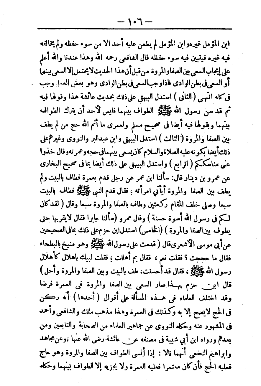 (الرَّابِعُ) وَاسْتَدَلَّ الْبَيْهَقِيُّ عَلَى ذَلِكَ أَيْضًا بِمَا فِي صَحِيحِ الْبُخَارِيِّ عَنْ عَمْرِو بْنِ دِينَارٍ قَالَ: سَأَلْنَا ابْنَ عُمَرَ عَنْ رَجُلٍ قَدِمَ بِعُمْرَةٍ فَطَافَ بِالْبَيْتِ وَلَمْ يَطُفْ بَيْنَ الصَّفَا وَالْمَرْوَةِ أَيَأْتِي امْرَأَتَهُ: فَقَالَ «قَدِمَ النَّبِيُّ - صَلَّى اللَّهُ عَلَيْهِ وَسَلَّمَ - فَطَافَ بِالْبَيْتِ سَبْعًا وَصَلَّى خَلْفَ الْمَقَامِ رَكْعَتَيْنِ وَطَافَ بِالصَّفَا وَالْمَرْوَةِ سَبْعًا وَقَالَ {لَقَدْ كَانَ لَكُمْ فِي رَسُولِ اللَّهِ أُسْوَةٌ حَسَنَةٌ} [الأحزاب: 21] » .