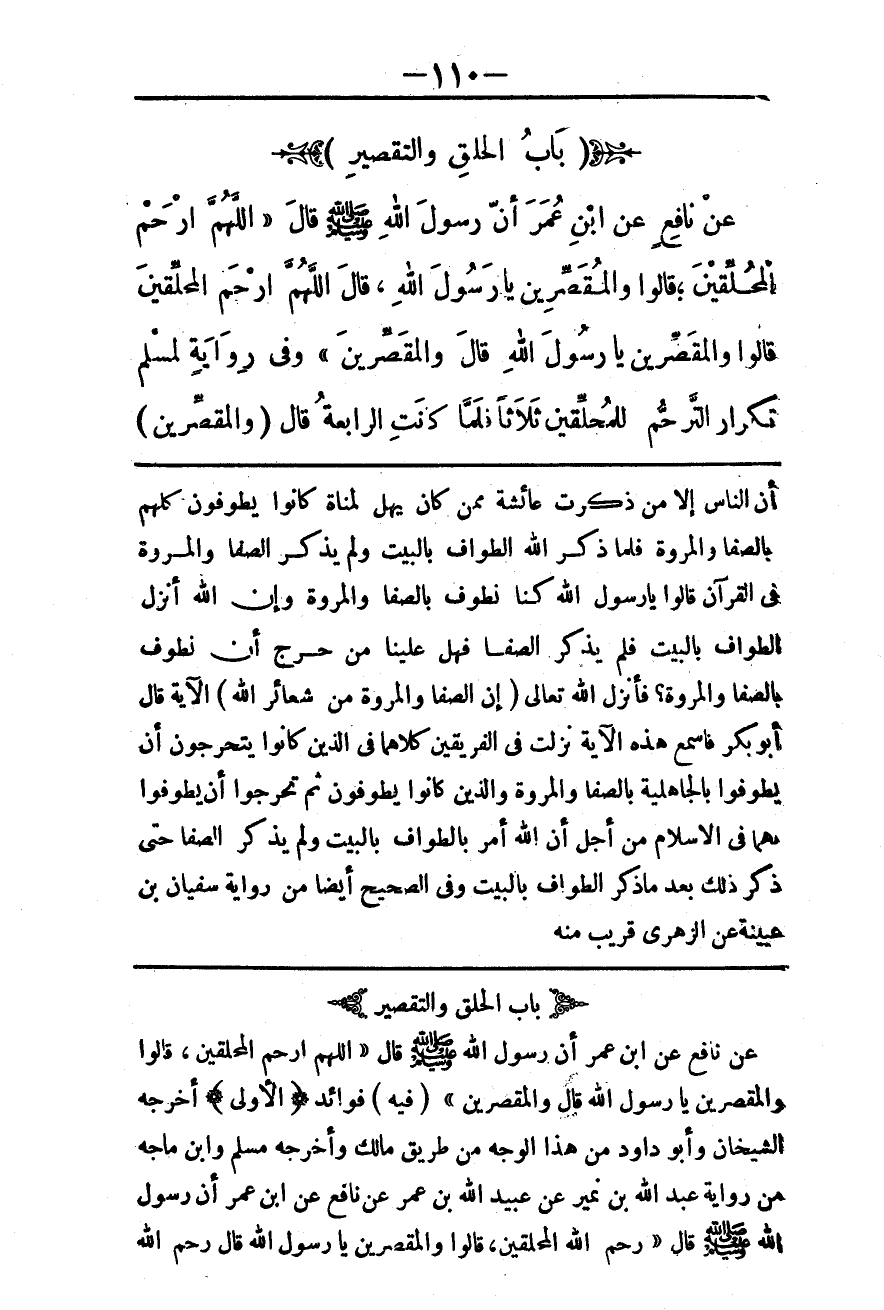 بَابُ الْحَلْقِ وَالتَّقْصِيرِ عَنْ نَافِعٍ عَنْ ابْنِ عُمَرَ أَنَّ رَسُولَ اللَّهِ - صَلَّى اللَّهُ عَلَيْهِ وَسَلَّمَ - قَالَ «اللَّهُمَّ ارْحَمْ الْمُحَلِّقِينَ؛ قَالُوا وَالْمُقَصِّرِينَ يَا رَسُولَ اللَّهِ، قَالَ اللَّهُمَّ ارْحَمْ الْمُحَلِّقِينَ قَالُوا وَالْمُقَصِّرِينَ يَا رَسُولَ اللَّهِ قَالَ وَالْمُقَصِّرِينَ» وَفِي رِوَايَةٍ لِمُسْلِمٍ تَكْرَارُ التَّرَحُّمِ لِلْمُحَلِّقِينَ ثَلَاثًا فَلَمَّا كَانَتْ الرَّابِعَةُ قَالَ «وَالْمُقَصِّرِينَ»