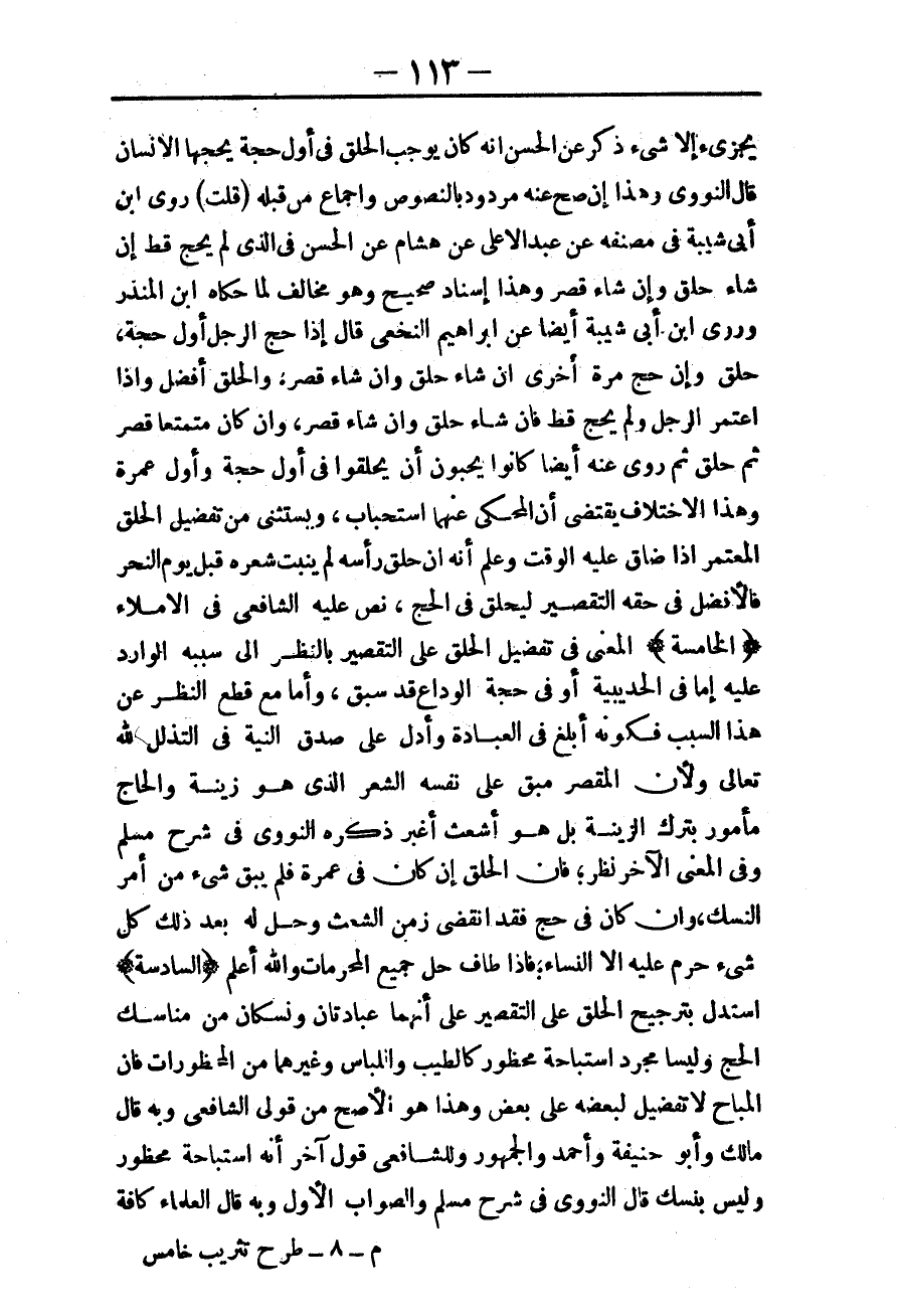 ـــــــــــــــــــــــــــــQيُجْزِئُ إلَّا شَيْءٌ ذُكِرَ عَنْ الْحَسَنِ أَنَّهُ كَانَ يُوجِبُ الْحَلْقَ فِي أَوَّلِ حَجَّةٍ يَحُجُّهَا الْإِنْسَانُ قَالَ النَّوَوِيُّ وَهَذَا إنْ صَحَّ عَنْهُ مَرْدُودٌ بِالنُّصُوصِ وَإِجْمَاعِ مَنْ قَبْلَهُ (قُلْتُ) رَوَى ابْنُ أَبِي شَيْبَةَ فِي مُصَنَّفِهِ عَنْ عَبْدِ الْأَعْلَى عَنْ هِشَامٍ عَنْ الْحَسَنِ فِي الَّذِي لَمْ يَحُجَّ قَطُّ إنْ شَاءَ حَلَقَ وَإِنْ شَاءَ قَصَّرَ وَهَذَا إسْنَادٌ صَحِيحٌ وَهُوَ مُخَالِفٌ لِمَا حَكَاهُ ابْنُ الْمُنْذِرِ وَرَوَى ابْنُ أَبِي شَيْبَةَ أَيْضًا عَنْ إبْرَاهِيمَ النَّخَعِيّ قَالَ إذَا حَجَّ الرَّجُلُ أَوَّلَ حُجَّةٍ، حَلَقَ وَإِنْ حَجَّ مَرَّةً أُخْرَى إنْ شَاءَ حَلَقَ وَإِنْ شَاءَ قَصَّرَ، وَالْحَلْقُ أَفْضَلُ وَإِذَا اعْتَمَرَ الرَّجُلُ وَلَمْ يَحُجَّ قَطُّ فَإِنْ شَاءَ حَلَقَ وَإِنْ شَاءَ قَصَّرَ، وَإِنْ كَانَ مُتَمَتِّعًا قَصَّرَ ثُمَّ حَلَقَ ثُمَّ رَوَى عَنْهُ أَيْضًا كَانُوا يُحِبُّونَ أَنْ يَحْلِقُوا فِي أَوَّلِ حَجَّةٍ وَأَوَّلِ عُمْرَةٍ وَهَذَا الِاخْتِلَافُ يَقْتَضِي أَنَّ الْمَحْكِيَّ عَنْهُمَا اسْتِحْبَابٌ، وَيُسْتَثْنَى مِنْ تَفْضِيلِ الْحَلْقِ الْمُعْتَمِرُ إذَا ضَاقَ عَلَيْهِ الْوَقْتُ وَعَلِمَ أَنَّهُ إنْ حَلَقَ رَأْسَهُ لَمْ يَنْبُتْ شَعْرُهُ قَبْلَ يَوْمِ النَّحْرِ فَالْأَفْضَلُ فِي حَقِّهِ التَّقْصِيرُ لِيَحْلِقَ فِي الْحَجِّ، نَصَّ عَلَيْهِ الشَّافِعِيُّ فِي الْإِمْلَاءِ.