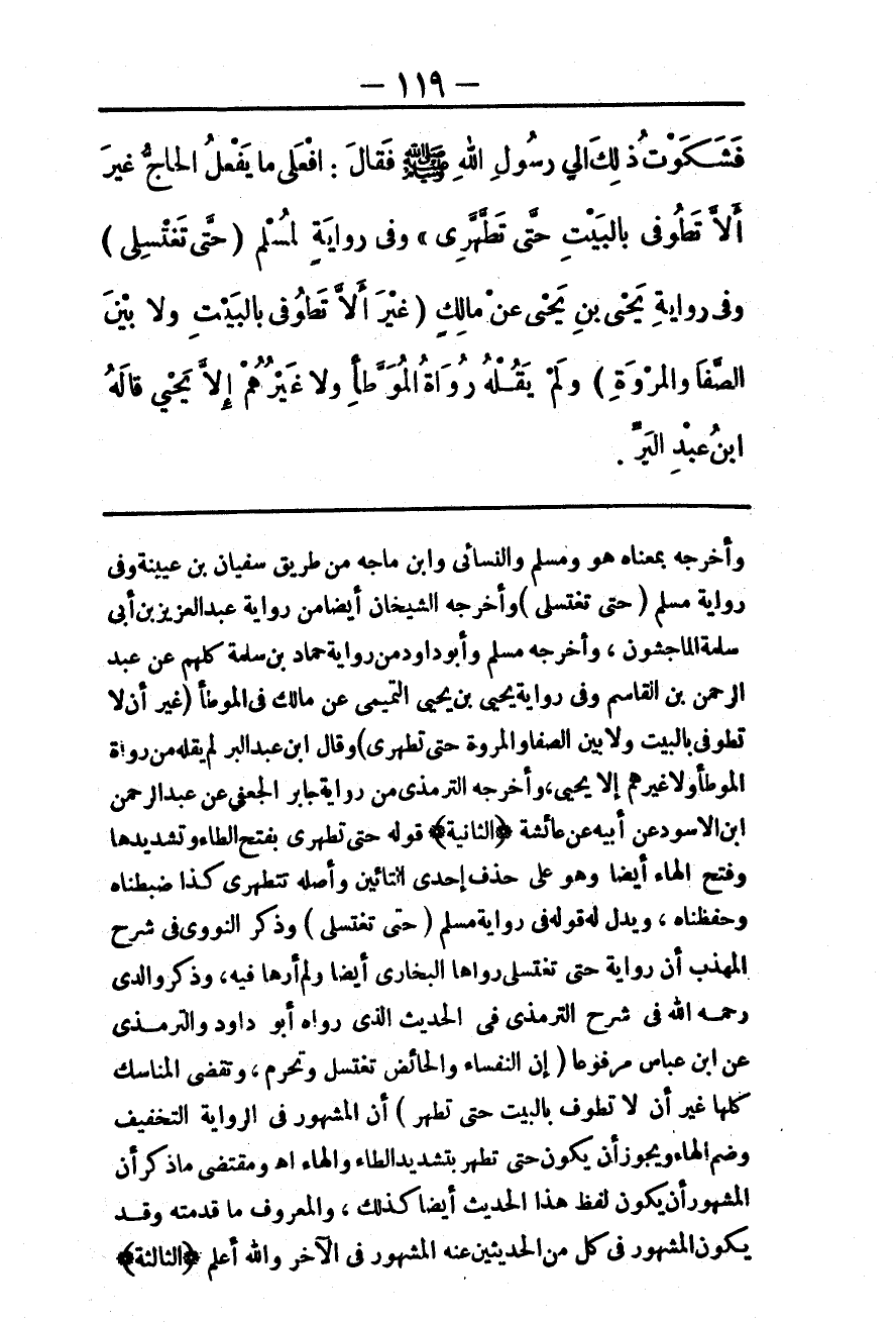 فَشَكَوْتُ ذَلِكَ إلَى رَسُولِ اللَّهِ - صَلَّى اللَّهُ عَلَيْهِ وَسَلَّمَ - فَقَالَ: افْعَلِي مَا يَفْعَلُ الْحَاجُّ غَيْرَ أَلَّا تَطُوفِي بِالْبَيْتِ حَتَّى تَطَّهَّرِي» وَفِي رِوَايَةٍ لِمُسْلِمٍ «حَتَّى تَغْتَسِلِي» وَفِي رِوَايَةِ يَحْيَى بْنِ يَحْيَى عَنْ مَالِكٍ «غَيْرَ أَلَّا تَطُوفِي بِالْبَيْتِ وَلَا بَيْنَ الصَّفَا وَالْمَرْوَةِ» وَلَمْ يَقُلْهُ رُوَاةُ الْمُوَطَّإِ وَلَا غَيْرُهُمْ إلَّا يَحْيَى قَالَهُ ابْنُ عَبْدِ الْبَرِّ